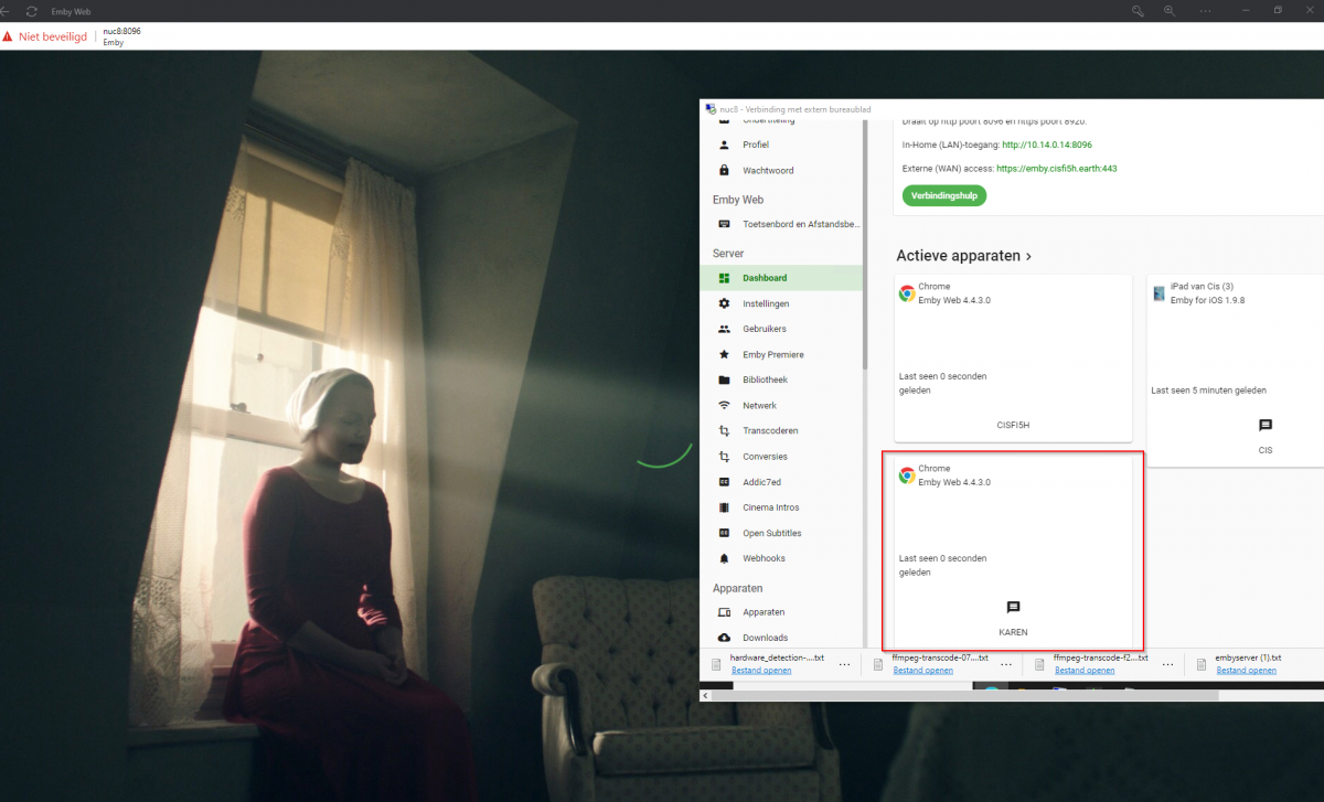 cisfi5h 2 Posted September 1, 2020 Posted September 1, 2020 All, I'm a very happy Emby user for almost 1 year now. Until now I did not have 1 error Since recently 1 user named "Karen" (I have 22 users now) is complaining that 1 show/series does not play. I logged in with the user "Karen" (Through browser) at my home PC. Under continue watching (screenshots are in Dutch), I can see the series that she was watching (In this case The Handsmaid's Tale S02E08) -> See screenshot image.png. If I click on the green button on this show, the browser shows the background image of the show but does not start (See 2nd screenshot).. I also don't get any buttons to go back. Only solution is closing the browser and logging in again. I checked the network path to this show. The file is a bluray rip 1080 x265. If I logon with any other user (I have 22 at the moment), the file plays just fine. Also the continu watching works with other users. I tested this with a user Cisther so you can compare them in the logs (See attachment for logs). With regards and keep up the good work! Cis Jacobs cis.jacobs@outlook.com embyserver (1).txt ffmpeg-transcode-12420001-e3fa-42b7-a002-137ca5b68908_1.txt hardware_detection-63734581915.txt
