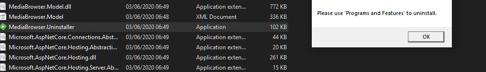 KaiKama 0 Posted September 6, 2020 Author Posted September 6, 2020 (edited) 5 minutes ago, seanbuff said: Did you perhaps install a portable version of Emby Server? Probably the quickest way to find out is to find the location of the running 'EmbyServer.exe' process. Go to Task Manager, find Emby Server and right-click 'Open file location' If it is in a location other than C:\Users\<USER>\AppData\Roaming\Emby-Server\system then you're probably running a portable copy, which would not show up in Add/Remove Programs. i definitely did not (i've had it installed for months, maybe even a year? i dunno, just know it's unlikely i chose portable) though this brings this up in C:\Windows.old************* as i've recently reinstalled windows which seems to create these "old" folders... found an uninstaller but it's telljng me to use programs and features to uninstall Edited September 6, 2020 by KaiKama