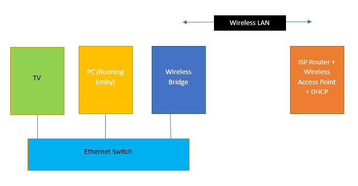 rbjtech 5284 Posted September 25, 2020 Posted September 25, 2020 (edited) A router is used for the routing/NAT only - it is not used for LAN traffic. Therefore as @vdatanet has said, you just need to create an Ethernet network (with a small gigabit switch), next to your PC and TV, plug them both into it - and then use a Wireless bridge plugged into the same Ethernet switch which will give you wireless access to your router for internet access and core LAN services such as DHCP. All emby traffic between your TV and PC (and anything else plugged into the switch) will stay wired. The downside is if you lose wireless, then you lose the internet on the wired network and the ability to renew your DHCP leases. edit - it's Friday afternoon and I'm bored - so a quick mock up below ... Edited September 25, 2020 by rbjtech 1 1