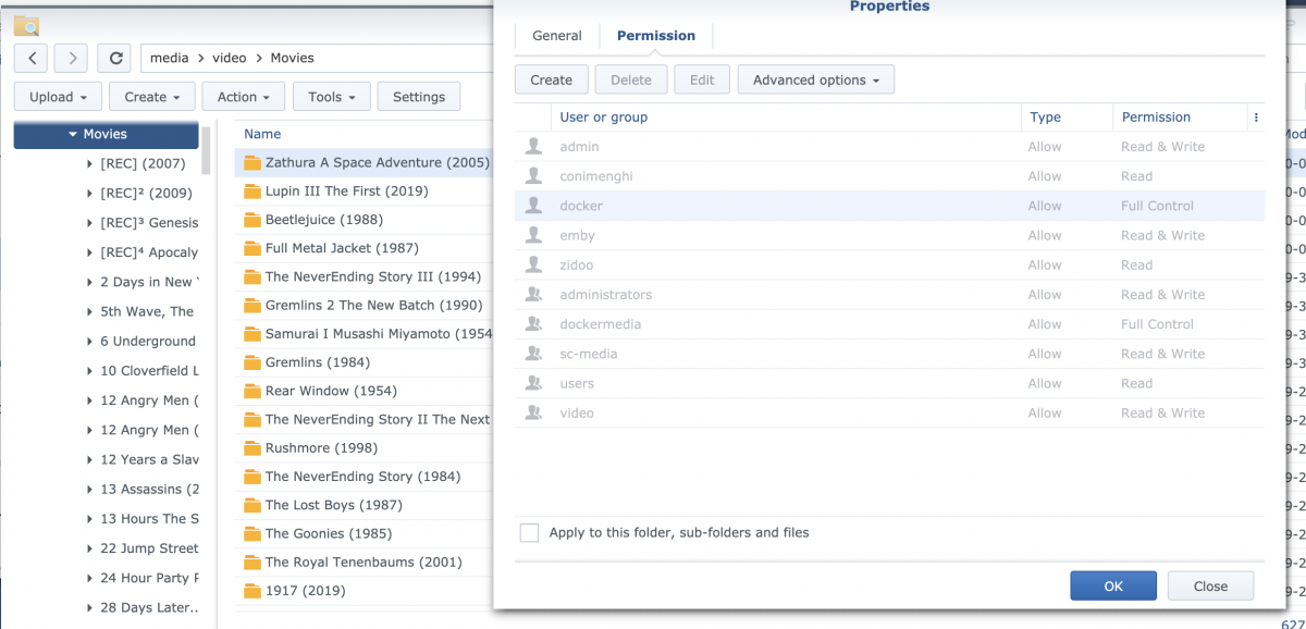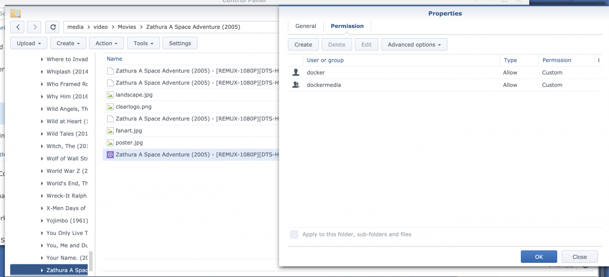 Ikario 39 Posted October 3, 2020 Posted October 3, 2020 Version: 4.5.1.0 Synology DS2415+ So I had no issues with Emby before updating. I get my movies from Sonarr/Radarr (docker containers) and using NZBGet/Transmission (also docker containers). They all share one user and group (docker/dockermedia). After downloading, Radarr moves the file to another folder. (/media/video/Movies and /mediavideo/TV) I realized that things downloaded after the update would get added to the library, but you I wasn't able to play them using my Nvidia Shield, browser or any other platform. Stuff downloaded before the update would play just fine. I narrowed it down to a permissions issue: can't really remember what permissions did the previous embysvr user had, but what I found out is that the new user emby does not have any file permissions at all to the downloaded file. I gave Emby RW access to my shared folder /media and all subfolders, however, it won't give RW permissions to the specific mkv files for some reason So, as an example: I download Zathura using Radarr and NZBGet. Radarr moves the file to the folder /media/video/Movies/Zathura A Space Adventure (2005)/Zathura A Space Adventure (2005) - [REMUX-1080P][DTS-HD MA 5.1][AVC]-HD.mkv Emby finds the file, and downloads ALL the metadata. Emby has RW permissions to the media/video/Movies/Zathura A Space Adventure (2005)/ and ALL the files in the folder except the mkv. Pictures below: 1) Permissions for the Zathura mkv file, no emby permission. 2)Permissions for an srt file: 3)Permissions for my folder So to recap: When the Zathura FOLDER is created, it is created with emby RW permission. When the file is linked/moved to that folder though, it does not have the inherited permissions. Fixing those permissions (giving Zathura...mkv RW permissions to Emby) makes the file playable again). So yeah, I'm kinda bummed and don't like when apps mess around with my permissions. It was working great before this and know it is not. For every movie I download I have to now fix manually that specific file's permission for it to work. Is there a way to fix this? Why was it working before the update and now it isn't?