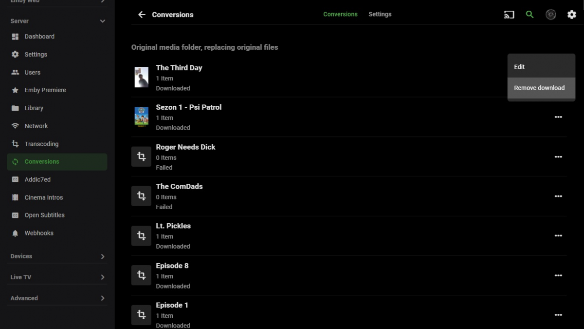 cochize1 55 Posted October 6, 2020 Author Posted October 6, 2020 Is there a way to clear all coversions files with one click (or maybe clear some cached files in the system) or it can only be done one by one? For some reason sometimes conversions just won't start on a single movie/episode and are marked as failed, what can be the reason for that?