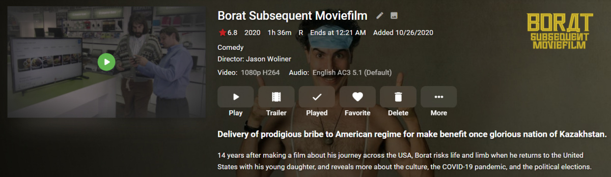 justsomebody 2 Posted October 27, 2020 Posted October 27, 2020 For a while now, whenever I download movies, Emby is giving them what seems to be usually a random still photo from the movie, instead of downloading an actual poster from a metadata provider. If I go in and do "Edit Images" and search for a poster, it finds them just fine and I can replace it. But I'm not sure why I have to keep doing this manually. An example, downloaded Borat yesterday, this is the "poster" Emby went with. It gets other metadata correct, and other images correct (e.g. logo, backdrop). But no good poster unless I search myself. Attached a log from when Borat was added to the library, and screenshot of relevant settings. "Download images in advance" is disabled, but I can't see why I would need that enabled, right? I mean, the problem isn't WHEN it's downloading images (and it gets the other images just fine), it's that it's not downloading a real poster at all. Ah ha, I just looked through the log and I found this - it appears to be extracting the thumbnail even though I have the "Generate video preview thumbnails" option set to "Never". Why? Is there a second setting somewhere that could be overriding this? (And indeed the image at the temp folder location shown in the log is the "poster" that it was using.) 2020-10-26 00:15:31.121 Info App: ProcessRun 'extract-image' Execute: C:\Users\li\AppData\Roaming\Emby-Server\system\ffmpeg.exe -ss 00:09:36.467 -f matroska -threads 1 -i file:"E:\My Videos\Movies\Borat Subsequent Moviefilm (2020)\_UNPACK_Borat.Subsequent.Moviefilm.2020.1080p.AMZN.WEBRip.DD5.1.X.264-EVO\ddf261d079924a41b2f4012b762735de.mkv" -an -sn -threads 0 -vframes 1 -vf "scale=trunc(min(max(iw\,ih*dar)\,min(600\,0*dar))/2)*2:trunc(min(max(iw/dar\,ih)\,min(600/dar\,0))/2)*2,thumbnail=24" -f image2 "C:\Users\li\AppData\Roaming\Emby-Server\programdata\cache\temp\0d6bcdea-1487-48ef-b08a-d86434f29820.jpg" 2020-10-26 00:15:32.761 Info App: ProcessRun 'extract-image' Process exited with code 0 Hmm - thinking this through as I type - is it because "Screen Grabber" is checked under "Movie image fetchers"? I don't recall every checking it on purpose, I assume it was enabled by default, but regardless, it's the last choice, and in this case (and in my experience pretty much all cases) TheMovieDb has plenty of actual posters that could have been chosen instead, since that's first in the list. If that's what is causing this (not that I'm sure it is - I'll uncheck it now and see if that makes a difference going forward), why would it be so consistently using the LAST choice of Screen Grabber for every move, when TheMovieDb is listed first and pretty much always has posters available? And it IS getting other images (logo, backdrop) from TheMovieDb. embyserver-63739331181.txt