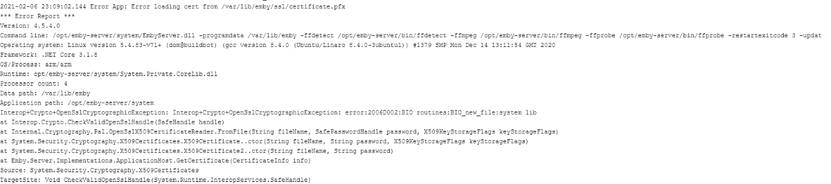 Q-Droid 989 Posted November 6, 2020 Posted November 6, 2020 It can't load the cert. 2020-11-06 21:17:13.982 Error App: Error loading cert from /var/lib/emby/ssl/certificate.pfx Are you sure the password is correct and emby can access the pfx file?