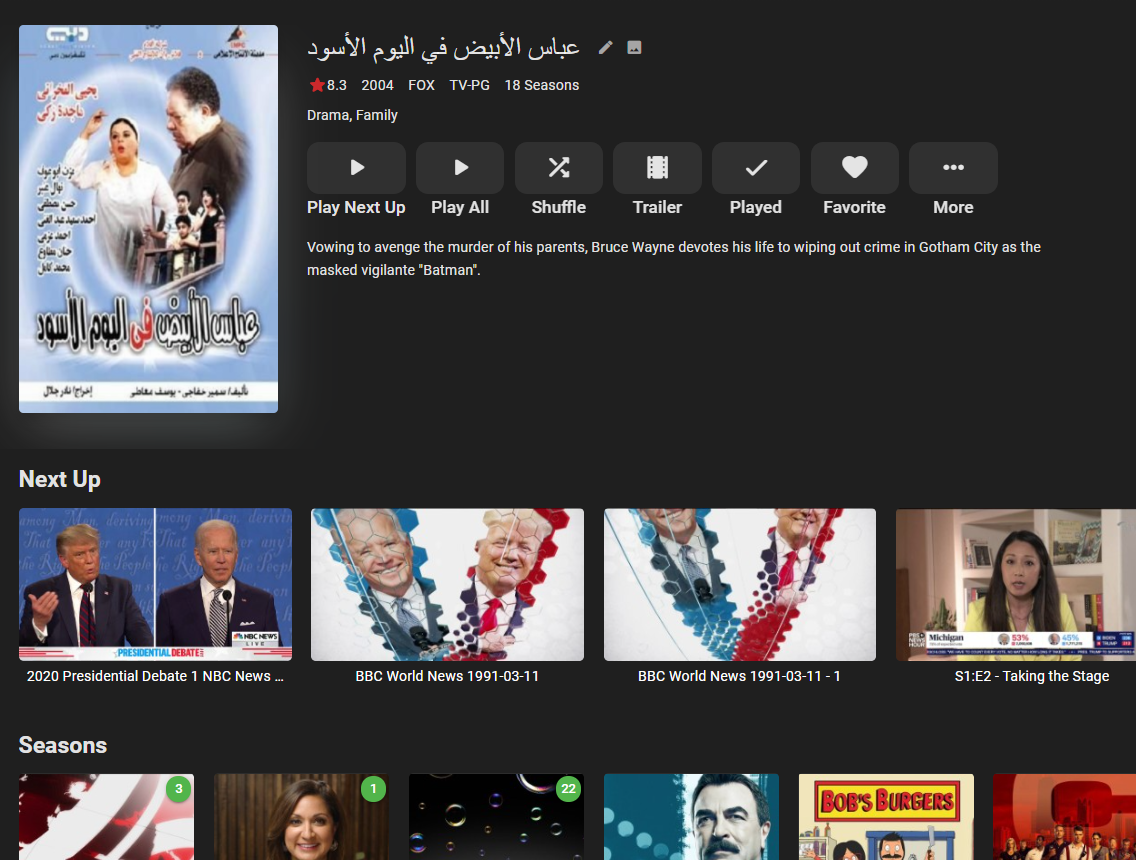 tadr 1 Posted November 6, 2020 Posted November 6, 2020 (edited) I use Emby with a HDHomerun TV tuner. I've noticed recently that if I record shows with numbers in the names, e.g., "PBS News Hour Election 2020," "2020 Presidential Debate NBC News Special," etc my recorded TV library no longer properly displays. Instead of displaying each show in a separate folder, all shows are displayed under a main folder with a random cover art image and what appears to be arabic or some other non-latin text, a description of some Batman show, with my individual shows displayed as seasons under that folder. As soon as I delete the offending recording folder and re-scan the library, everything displays properly again. I've attached screenshots so you can see what I mean. This has been a particular problem with recorded election coverage. Is this a known issue? I understand there are restrictions for TV episode naming, but these are recordings from the HDHomerun using the Live/Recorded TV functionality from Emby itself, so I am not controlling the naming (unless I manually go in and edit it). Edited November 6, 2020 by tadr