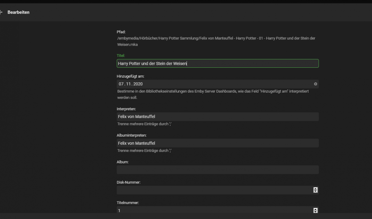 horstepipe 422 Posted November 9, 2020 Author Posted November 9, 2020 (edited) so I'm not able to give reproduction steps for exactly this problem, but I am able to give reproduction steps to show there is some inconsistency at all. I tested on a fresh Emby Server installation (Windows 10). Just add the attached folder to an audio book library, check and note the artist and album artists Emby is showing, remove the folder from Emby library and change the album artist field to e.g. "album artist 2". Now add the folder back to Emby, take a look at artists and album artists field and repeat the whole process (editing the album artists tag). You will see strange results. E.g. while I'm just testing around I see this inconsistency: In words: I didn't touch the "artists" tag of the file, but Emby doesn't show the artist anymore. Test Audio Book.7z Edited November 9, 2020 by horstepipe