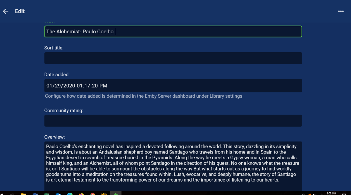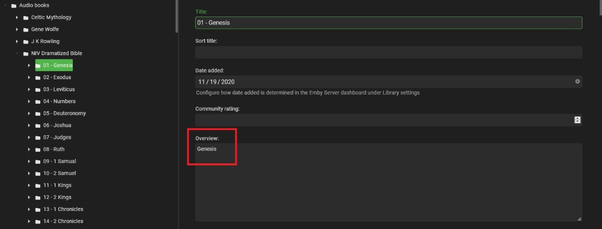 Friends 2 Posted November 20, 2020 Posted November 20, 2020 I created an audiobook library. I right click the book and click "edit metadata" Edit information regarding the book into the "Overview" and save. Yet the overview information is not viewable in Emby. Am I not doing something correct? Why is that available but not viewable? Cheers, Friends