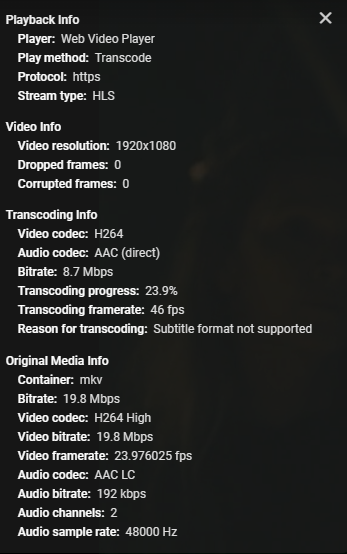 atgomez6555 0 Posted November 30, 2020 Posted November 30, 2020 Hello, I am trying to stream a show with PGSSUB on Google Chrome in my browser. I understand Chrome does not support PGSSUB, so the fact that transcoding is happening is not the issue. The issue is no matter what settings I choose, it will only transcode at 2-2.7 mbps bitrate. The media itself is 30 mbps, and I am on a local ethernet connection. I have no profile settings restricting transcoding, and "normal" transcoding off network allows me to change bitrate. It seems to be an issue specific to the forced transcoding due to subtitles that makes it transcode at such a low bitrate.