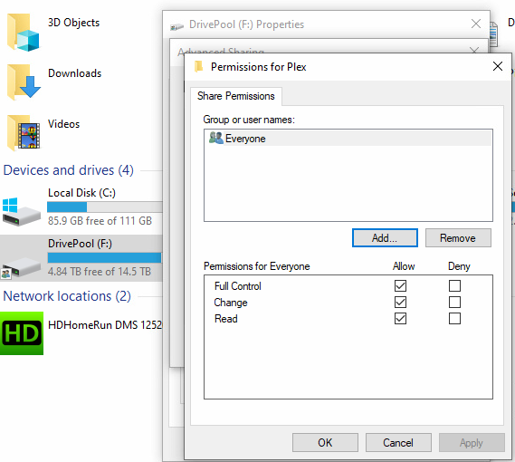 prestonplex 0 Posted December 4, 2020 Author Posted December 4, 2020 9 minutes ago, cayars said: I'm seeing entries in your log file such as System.UnauthorizedAccessException: System.UnauthorizedAccessException: Access to the path '/storage/GPDPBOX/Plex/PlexMedia/Plex Complete/TV/Surviving R.Kelly' is denied. ---> System.IO.IOException: Permission denied This looks like a permission problem. I don't understand why? The whole server is shared across the network. See attached my share permissions. Nvidia shield can access, Plex can access it..... but why can't Emby?