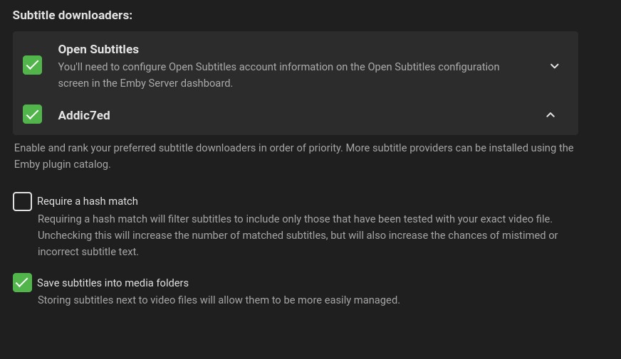 Luke 42077 Posted December 11, 2020 Posted December 11, 2020 1 minute ago, tophneal said: I'm seeing this issue, too. With OpenSubtitles and Addic7ed. I've verified that my library settings have both listed/enabled. In the library settings, OpenSubtitles has a warning that my account needs to be setup, but the information is already populated and saved in the plugin settings. (I've clicked Save more than a few times.) When searching for subtitles, I also see "No results found. Have you configured subtitle downloading?" I've tried uninstalling, restarting Emby server, reinstalling, restarting again, then configuring with both plugins, with no success. Hi, there's no problem with open subtitles. Usually it's a matter of your filters are too strict causing no results to come back. Please see this guide on automated downloads: https://support.emby.media/support/solutions/articles/44001848854-automatic-subtitle-downloads and manual downloads: https://support.emby.media/support/solutions/articles/44001848856-manual-subtitle-downloads Depending on which one you're using.