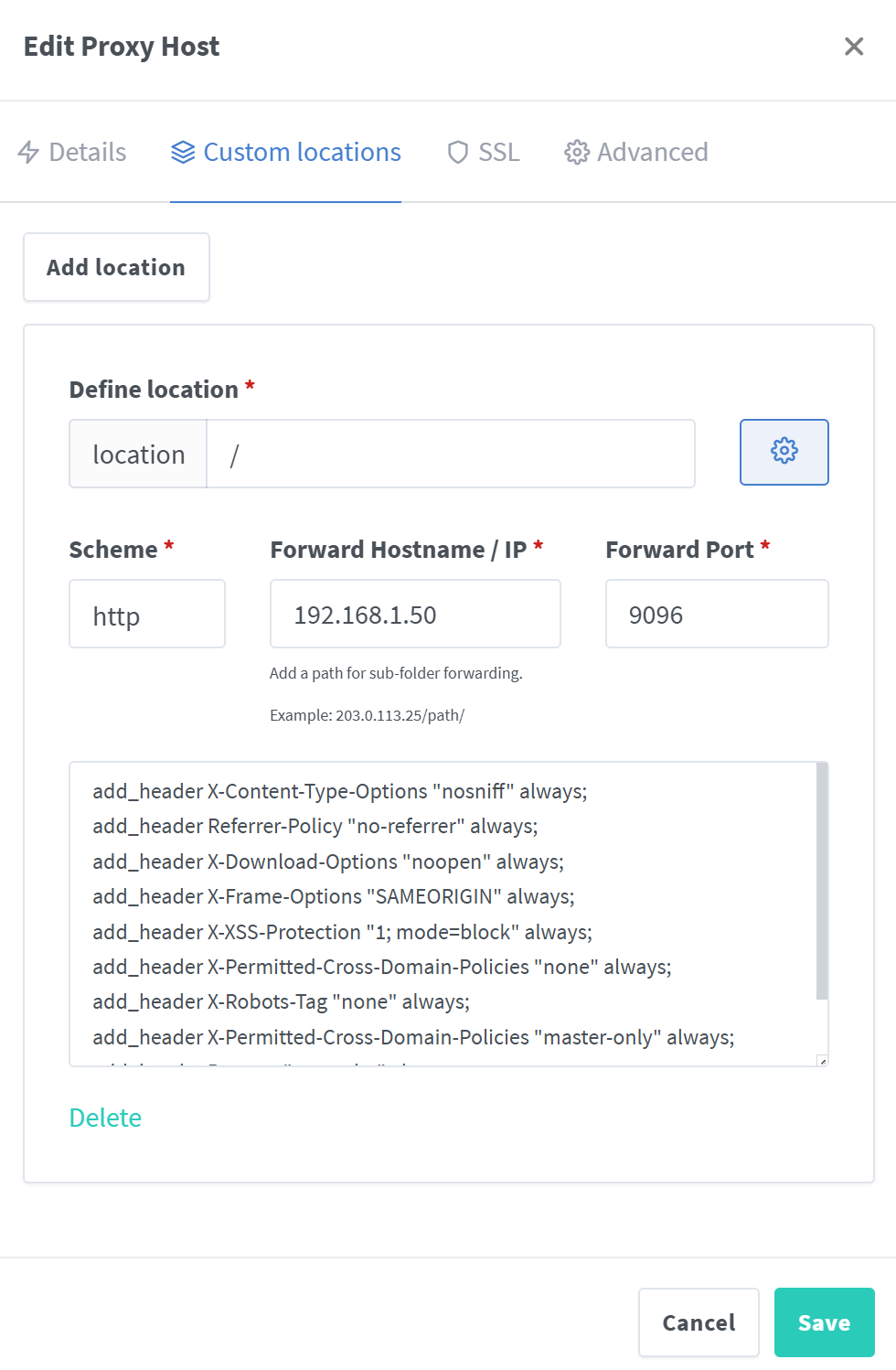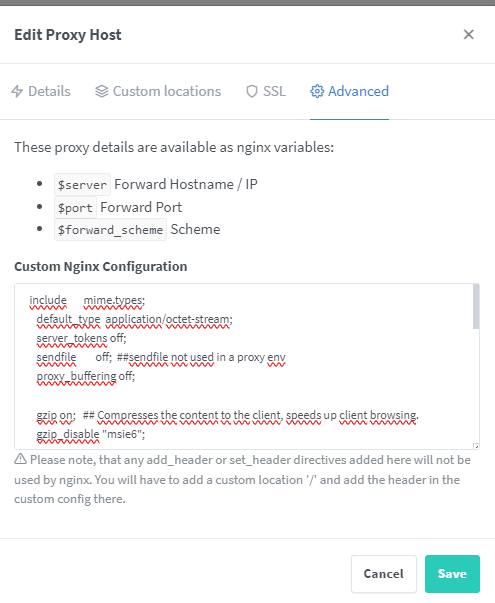 guunter 49 Posted September 13, 2024 Posted September 13, 2024 4 hours ago, Moreje said: I don't know what you mean by syntax, I put exactly this: and this line results in emby not reachable (error 400) if I comment it out: access is possible Did you try Emby without these advanced options? It should still work without those settings in there for location.