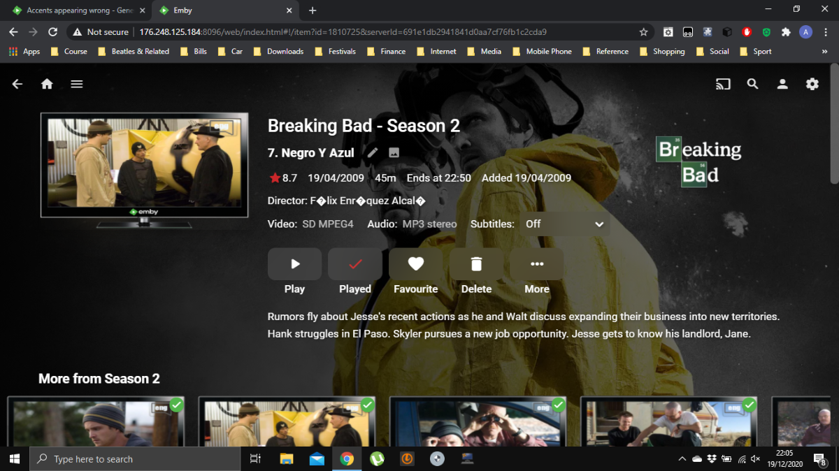 Happy2Play 9780 Posted December 20, 2020 Posted December 20, 2020 Testing this on a clean install in stable and beta on this specific episode, with providers as TMDB then TVDB do to TVDB having name without accents until data propagates, I do not get the results shown above. Clean install so person never existed in database. here is the nfo Emby created Spoiler <?xml version="1.0" encoding="utf-8" standalone="yes"?> <episodedetails> <plot><![CDATA[Jesse and Walt discuss expanding into new territories; Hank struggles to fit in; Skyler pursues a new job opportunity; Jesse gets to know his landlord.]]></plot> <outline /> <lockdata>false</lockdata> <dateadded>2020-12-19 14:15:29</dateadded> <title>Negro y Azul</title> <director>Félix Enríquez Alcalá</director> <rating>8</rating> <year>2009</year> <imdbid>tt1232254</imdbid> <tvdbid>438918</tvdbid> <actor> <name>Bryan Cranston</name> <role>Walter White</role> <type>Actor</type> </actor> <actor> <name>Aaron Paul</name> <role>Jesse Pinkman</role> <type>Actor</type> </actor> <actor> <name>Anna Gunn</name> <role>Skyler White</role> <type>Actor</type> </actor> <actor> <name>Dean Norris</name> <role>Hank Schrader</role> <type>Actor</type> </actor> <actor> <name>Betsy Brandt</name> <role>Marie Schrader</role> <type>Actor</type> </actor> <actor> <name>RJ Mitte</name> <role>Walter White Jr.</role> <type>Actor</type> </actor> <actor> <name>Krysten Ritter</name> <role>Jane Margolis</role> <type>GuestStar</type> </actor> <actor> <name>J.D. Garfield</name> <role>DEA Agent Vanco</role> <type>GuestStar</type> </actor> <actor> <name>Rio Alexander</name> <role>Federale</role> <type>GuestStar</type> </actor> <actor> <name>Danny Trejo</name> <role>Tortuga</role> <type>GuestStar</type> </actor> <actor> <name>Christopher Cousins</name> <role>Ted Beneke</role> <type>GuestStar</type> </actor> <actor> <name>Todd Terry</name> <role>SAC Ramey</role> <type>GuestStar</type> </actor> <actor> <name>Matt Jones</name> <role>Badger</role> <type>GuestStar</type> </actor> <actor> <name>Charles Baker</name> <role>Skinny Pete</role> <type>GuestStar</type> </actor> <episode>7</episode> <season>2</season> <aired>2009-04-18</aired> <fileinfo> <streamdetails /> </fileinfo> </episodedetails> OT: Only issue I see is the person was not processed to get any info (episode level), ran refresh people task with no change, have to manually refresh. But I don't believe this is a new issue as I see this a lot at episode level. One other actor was not fetched also "Rio Alexander". So it is a little quirky as only 2 of 15 were not fetched. First 6 are gotten at Serie level.
