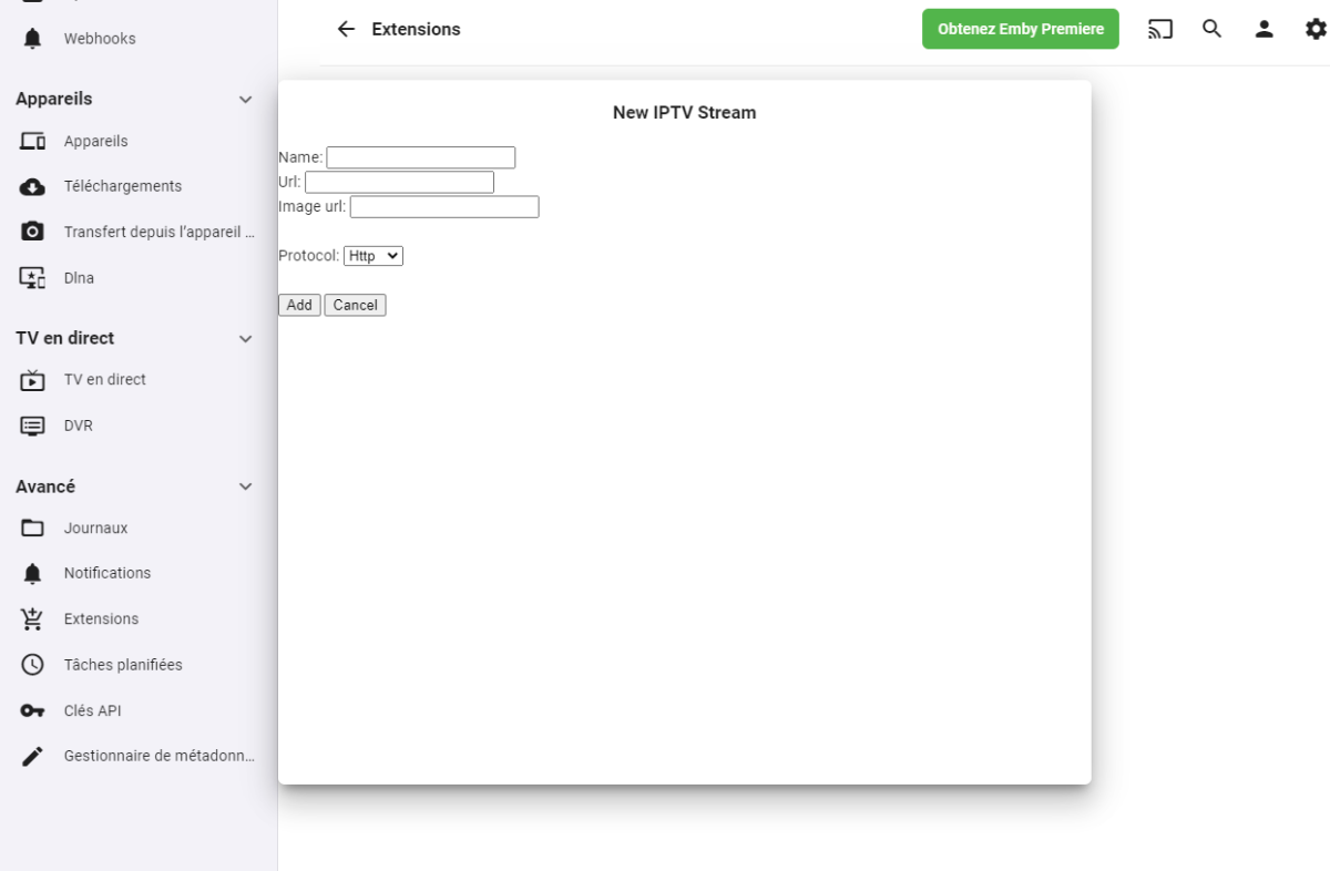 phxardant 0 Posted December 20, 2020 Posted December 20, 2020 Bonjour je voudrais voir les chaine de ma freebox sur emby avec l'extention IPTV J'ai essayer en utilisant cet adresse mais sans succès ( http://mafreebox.freebox.fr/freeboxtv/playlist.m3u) J'ai peu etre oublier quelquechose, si quelqu'un peu m'aider.