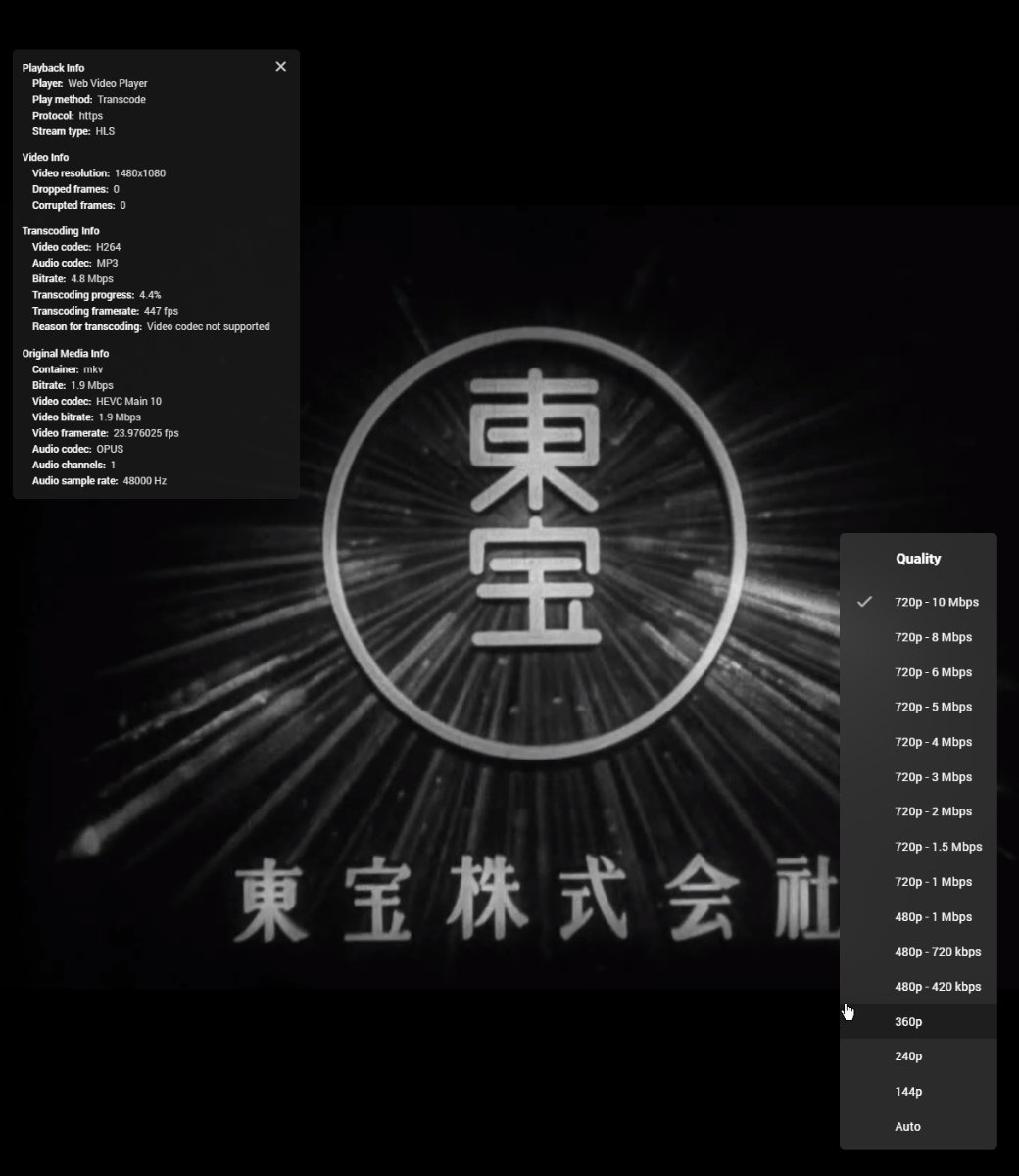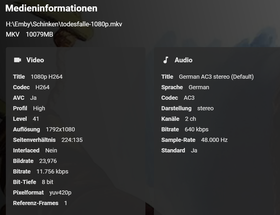 mholin 23 Posted December 30, 2020 Author Posted December 30, 2020 I did a further analysis on the 'Deadfall' movie. During playback, I only see bitrate options to set with max 720p 10 mbit. I choosed 720p 10 mbit. Here are some lines from ffmpeg-transcode log: 18:25:34.042 encoder : libebml v1.2.2 + libmatroska v1.3.0 18:25:34.042 creation_time : 2013-12-05T07:03:53.000000Z 18:25:34.042 Duration: 01:59:51.26, start: 0.000000, bitrate: 11756 kb/s 18:25:34.042 Stream #0:0: Video: h264 (High), yuv420p(progressive), 1792x1080, SAR 1:1 DAR 224:135, Level 41, 23.98 fps, 23.98 tbr, 1k tbn, 47.95 tbc (default) 18:25:34.043 Stream #0:1(ger): Audio: ac3, 48000 Hz, stereo, fltp, 640 kb/s (default) 18:25:34.043 Metadata: 18:25:34.043 title : German 18:25:34.043 Stream #0:2(eng): Audio: ac3, 48000 Hz, stereo, fltp, 640 kb/s 18:25:34.043 Metadata: 18:25:34.043 title : English 18:25:34.296 Stream mapping: 18:25:34.296 Stream #0:0 -> #0:0 (h264 (h264_cuvid) -> h264 (h264_nvenc)) 18:25:34.296 Stream #0:1 -> #0:1 (ac3 (native) -> mp3 (libmp3lame)) 18:25:34.296 Press [q] to stop, [?] for help 18:25:34.432 Output #0, segment, to 'v:\transcoding-temp\81D384_%d.ts': 18:25:34.432 Metadata: 18:25:34.432 encoder : Lavf58.35.100 18:25:34.432 Stream #0:0: Video: h264 (h264_nvenc) (High), cuda, 1792x1080 [SAR 1:1 DAR 224:135], q=-1--1, 9360 kb/s, 23.98 fps, 90k tbn, 23.98 tbc (default) 18:25:34.432 Metadata: 18:25:34.432 encoder : Lavc58.62.100 h264_nvenc 18:25:34.432 Side data: 18:25:34.432 cpb: bitrate max/min/avg: 9360000/0/9360000 buffer size: 18720000 vbv_delay: N/A 18:25:34.433 Stream #0:1(ger): Audio: mp3 (libmp3lame), 48000 Hz, stereo, fltp, 192 kb/s (default) then I choosed 720p 6 mbit. Here are some lines from ffmpeg-transcode log: 10:44:27.878 encoder : libebml v1.2.2 + libmatroska v1.3.0 10:44:27.878 creation_time : 2013-12-05T07:03:53.000000Z 10:44:27.878 Duration: 01:59:51.26, start: 0.000000, bitrate: 11756 kb/s 10:44:27.879 Stream #0:0: Video: h264 (High), yuv420p(progressive), 1792x1080, SAR 1:1 DAR 224:135, Level 41, 23.98 fps, 23.98 tbr, 1k tbn, 47.95 tbc (default) 10:44:27.879 Stream #0:1(ger): Audio: ac3, 48000 Hz, stereo, fltp, 640 kb/s (default) 10:44:27.879 Metadata: 10:44:27.879 title : German 10:44:27.879 Stream #0:2(eng): Audio: ac3, 48000 Hz, stereo, fltp, 640 kb/s 10:44:27.879 Metadata: 10:44:27.879 title : English 10:44:28.236 Stream mapping: 10:44:28.236 Stream #0:0 -> #0:0 (h264 (h264_cuvid) -> h264 (h264_nvenc)) 10:44:28.236 Stream #0:1 -> #0:1 (ac3 (native) -> mp3 (libmp3lame)) 10:44:28.236 Press [q] to stop, [?] for help 10:44:28.477 Output #0, segment, to 'v:\transcoding-temp\758BCE_%d.ts': 10:44:28.477 Metadata: 10:44:28.477 encoder : Lavf58.35.100 10:44:28.477 Stream #0:0: Video: h264 (h264_nvenc) (High), cuda, 1792x1080 [SAR 1:1 DAR 224:135], q=-1--1, 5360 kb/s, 23.98 fps, 90k tbn, 23.98 tbc (default) 10:44:28.477 Metadata: 10:44:28.477 encoder : Lavc58.62.100 h264_nvenc 10:44:28.478 Side data: 10:44:28.478 cpb: bitrate max/min/avg: 5360000/0/5360000 buffer size: 10720000 vbv_delay: N/A 10:44:28.478 Stream #0:1(ger): Audio: mp3 (libmp3lame), 48000 Hz, stereo, fltp, 192 kb/s (default) it looks like, the 720p from the 'quality menu' is ignored, but the bitrate is set properly. 1