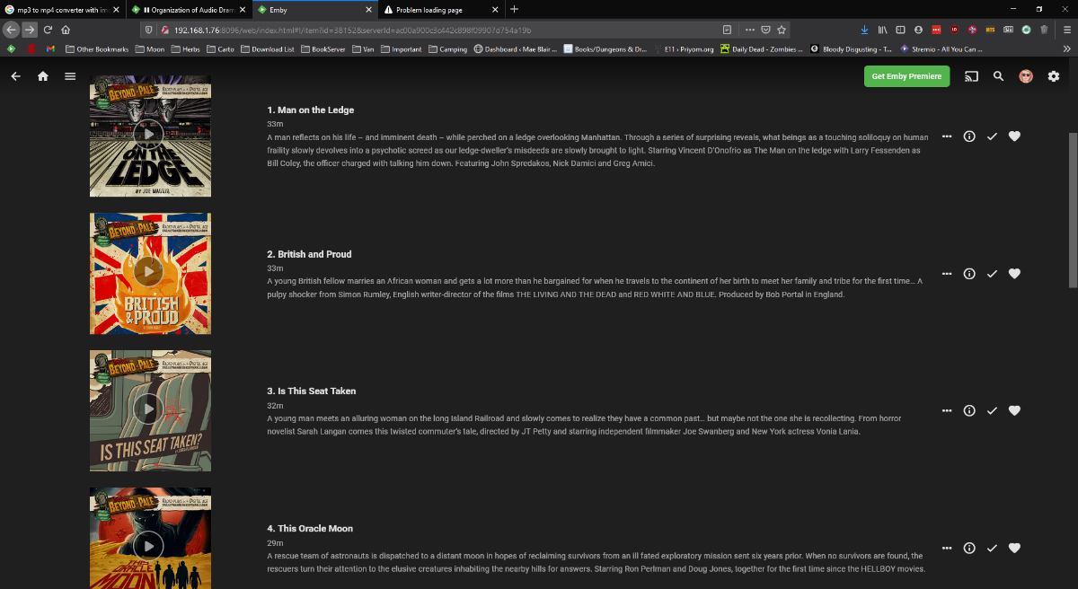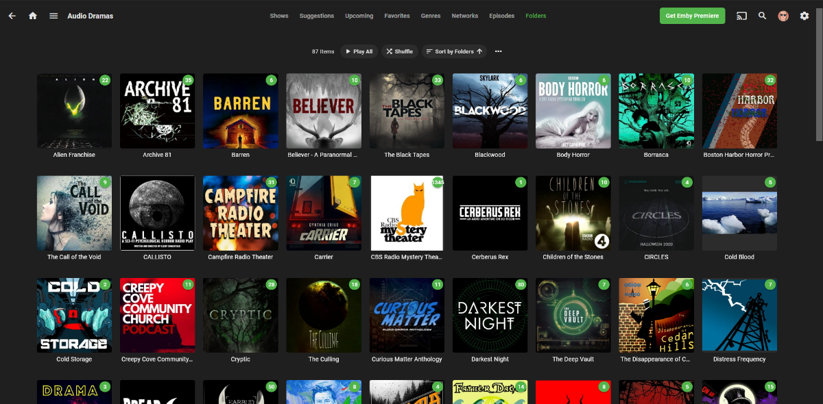 Mimcentric 1 Posted January 19, 2021 Author Posted January 19, 2021 (edited) On 1/8/2021 at 7:08 PM, cayars said: OK understand what they are now and was kind of what I thought but wanted to check and not assume. It would seem audiobook library type would be the one to use but you said you have an issue with it. Can you show a screenshot maybe marked up to show what doesn't work well for you? Sorry for the late reply. I have very spotty internet service. Basically, I want to display and sort them like a TV show. With the audiobook library, my files look like this for audio dramas with seasons: When I would like them to look like this: In the audiobook format, it treats each episode like a book chapter. Since the audio dramas are essentially just radio television shows, I'd like to sort them that way. Another example are anthology series. For Tales From Beyond the Pale, I have to separate each individual episode into different files in order to display their unique cover art for each story. This is pretty common for anthologies as well as seasonal series. When having them display like a TV series makes it much easier to browse story description per episode while still displaying the unique artwork. Since a lot of anthologies also have seasons, it makes sorting them much easier. Larger series (such as CBS Radio Myster Theater, with over 1,400 episodes) would really benefit from the TV library format for easy choice of which episode to play, since the audiobook format doesn't display episode descriptions. The visual display of how many episodes are remaining per series is also nice, which is another thing the audiobook library doesn't support. I was able to trick emby into using the TV library for my audio dramas by changing the extension to .mp4 with the tradeoff of being unable to resume in the middle of an episode. Is there another way to get the TV library to accept mp3 files? Does the Podcast library sort this way? If there are no other libraries that can sort mp3 files in this manner, I'd love to leave that as a suggestion or allow the TV library type to accept mp3s. Edited January 19, 2021 by Mimcentric adding more info