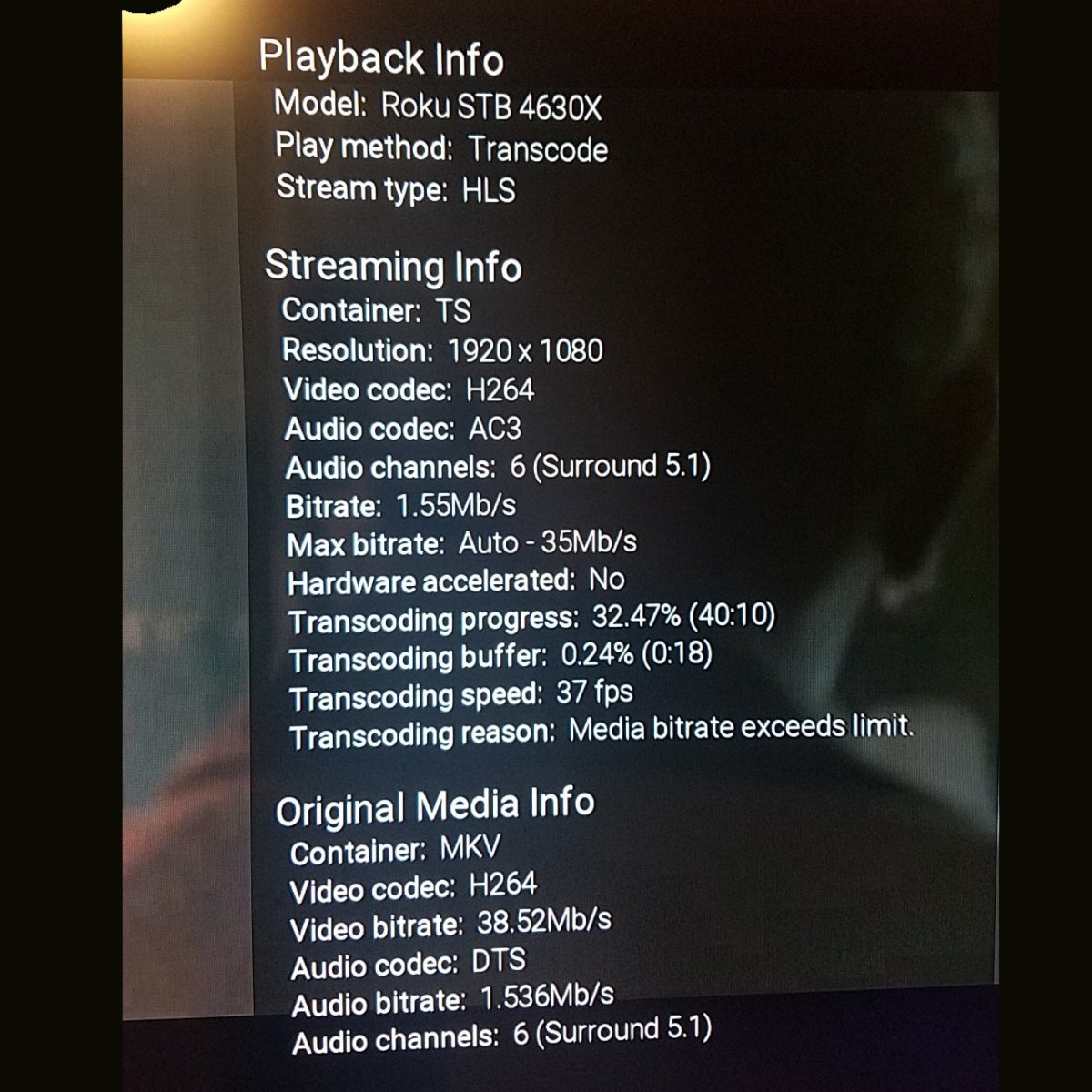 EZEd 60 Posted January 9, 2021 Posted January 9, 2021 Okay, I know this has been covered in a myriad of threads here in the forum but I've read so many and gotten very confused over what is what. Maybe some here can help unravel. My server rig is a Windows 10 x64 desktop with AMD Radeon HD6450 graphics card running latest stable server. I have HW acceleration turned on in server settings. This is being served house wide to all clients via wired gigabit lan. At the distant ends (two pictures below) I have a Roku Premiere and Jetstream Ematic Android TV box, Roku is standard 2K HD, Android TV box is 4K HD. The picture is playing the same film, a straight MKV rip (using MakeMKV) from a standard BluRay (2K) and DTS-MA/HD soundtrack. Both boxes are "transcoding" according to stats for nerds. Questions: 1) What is transcoding? Is it the server that is transcoding to the client boxes because neither can play DTS-MA/HD soundtracks directly? 2) ... or is the server passing the raw stream to the clients and then the clients are transcoding because they can't direct play DTS-MA/HD audio natively? 3) How do I know if my server is doing the heavy lifting versus my clients? 4) How can I rip/save my files (BluRay rips) such that nobody is doing heavy lifting and nothing is transcoded (at either the server OR client level)? Any help/advice would be appreciated. Roku Image: Android TV Image