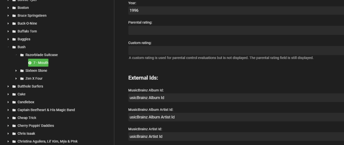 kevinofoz 0 Posted January 11, 2021 Posted January 11, 2021 I am running Emby on my Sonology NAS. While Emby was running (clean install), I copied over a couple hundred songs from my Windows PC onto the share that has been setup in Emby as my music folder on my NAS. The folder structure is pretty basic (Artist -> Album -> Song). And all MP3s are tagged with artist, album, song, etc. In this case, the first artist alphabetically was "`Til Tuesday". About 60% of the music library appears to have the artist and album artist labeled as "`Til Tuesday", which I can assure you is not the case in the MP3 file itself. In the logs file, you can see one case. Search for Glycerine (by Bush) and you will find an example of a file that was processed correctly. In the logs, I see a request for "https://musicbrainz.emby.tv/ws/2/artist/?query=arid:93ccd76c-3790-4435-a8bf-02bc26294b93" and I see UUIDs in the MusicBrainz tags. Search for Mouth (also by Bush) and you will see a request for "http://coverartarchive.org/release/usicBrainz Album Id" I have also seen this with other collections and other songs on clean installs. It seems like Emby cannot recognize the Artist (even though it is in the tag and folder name) and so errors out with the ID and defaults to the first artist that was processed. All other data does seem correct. Even the genre. But this is obviously a big deal if I can't find my songs. embyserver.txt
