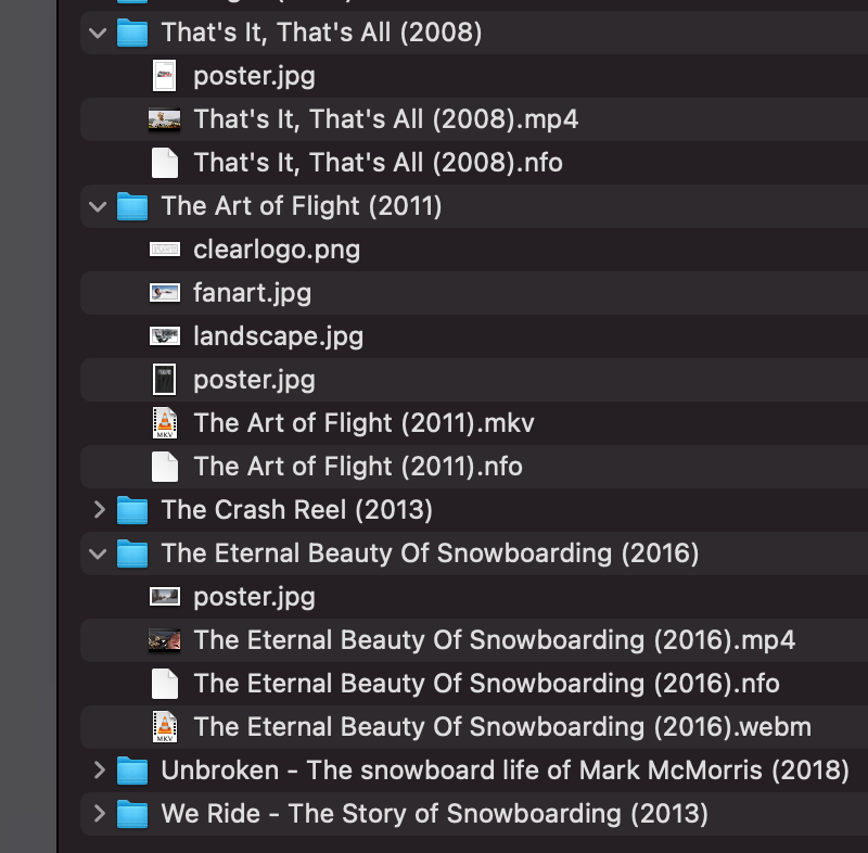 Carlo 4561 Posted January 12, 2021 Posted January 12, 2021 (edited) 1 hour ago, Gilgamesh_48 said: Quite different. Maybe it is because you are using separate directories for each movie? Personally I have never seen the point to that. Directory of K:\AllMovies\H\Hostel Trilogy 01/11/2021 09:09 PM <DIR> . 01/11/2021 09:09 PM <DIR> .. 01/11/2021 09:09 PM 0 dir.txt 04/19/2019 06:18 PM 3,806,012 Hostel (2006)-320-10.bif 07/14/2020 09:06 PM 245,934 Hostel (2006)-banner.jpg 07/14/2020 09:06 PM 307,501 Hostel (2006)-clearart.png 05/31/2020 05:20 PM 142,503 Hostel (2006)-clearlogo.png 07/14/2020 09:06 PM 556,712 Hostel (2006)-discart.png 05/31/2020 05:20 PM 337,139 Hostel (2006)-fanart.jpg 07/14/2020 09:06 PM 369,516 Hostel (2006)-fanart1.jpg 07/14/2020 09:06 PM 363,190 Hostel (2006)-fanart2.jpg 05/31/2020 05:20 PM 488,799 Hostel (2006)-landscape.jpg 05/31/2020 05:20 PM 334,332 Hostel (2006)-poster.jpg 12/15/2018 12:18 AM 772,230,179 Hostel (2006).mkv 12/20/2020 10:40 PM 5,424 Hostel (2006).nfo 04/19/2019 06:19 PM 5,777,051 Hostel - Part II (2007)-320-10.bif 07/14/2020 09:06 PM 123,307 Hostel - Part II (2007)-banner.jpg 05/31/2020 05:20 PM 41,593 Hostel - Part II (2007)-clearlogo.png 07/14/2020 09:06 PM 1,357,055 Hostel - Part II (2007)-discart.png 05/31/2020 05:20 PM 256,511 Hostel - Part II (2007)-fanart.jpg 07/14/2020 09:06 PM 125,762 Hostel - Part II (2007)-fanart1.jpg 07/14/2020 09:06 PM 222,085 Hostel - Part II (2007)-fanart2.jpg 05/31/2020 05:20 PM 566,651 Hostel - Part II (2007)-landscape.jpg 05/31/2020 05:20 PM 221,633 Hostel - Part II (2007)-poster.jpg 12/15/2018 12:18 AM 783,396,779 Hostel - Part II (2007).mkv 07/16/2020 05:37 PM 4,340 Hostel - Part II (2007).nfo You my friend would not be happy if you delete a movie and the folder is removed as has happened in the past. You also can't use some of Emby's advanced features with that layout. For best overall experience and functionality you want each movie in it's own folder named with the year for best matching and features. Theme Music and theme videos come to mind as quick examples as well as some 3rd party plugins that won't work with that structure properly. There is a reason for the recommended structure given in the Knowledge Base. Edited January 12, 2021 by cayars