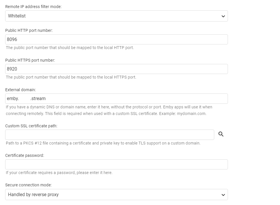 Q-Droid 989 Posted January 16, 2021 Posted January 16, 2021 (edited) Apps don't like HTTP redirects . Does using host and port in the app setup make a difference? With 301s in the global section that might be throwing the apps a response they don't like. Since you also mentioned CloudFlare are you using it for anything other than DNS? And your public port settings in Emby should match your entry point (proxy) ports. Edited January 16, 2021 by Q-Droid 1