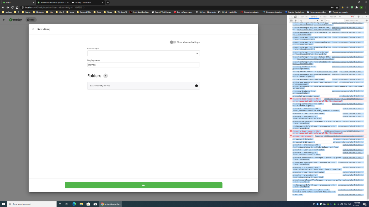 Apostolos M. 1 Posted January 23, 2021 Author Posted January 23, 2021 (edited) Let's start from the beginning. Yesterday I did a fresh installation of Windows (10 x64 build 19042.746) in order to solve this issue. After installation was completed and all drivers were installed, I installed Chrome latest version (88.0.4324.104 (Official Build) (64-bit)). After that I installed Emby server and after I chose language and I gave my username and password I tried to build a new library. On the new library screen I chose my movies folder but I cannot choose the content type. The drop down box does not drop. Also when I press the ok button nothing happens. I am sending a screenshot. I tried Edge as well but the same thing happens. I am sending also from Chrome Developer tools, the Console log. localhost-1611380842875.log Edited January 23, 2021 by Apostolos M.