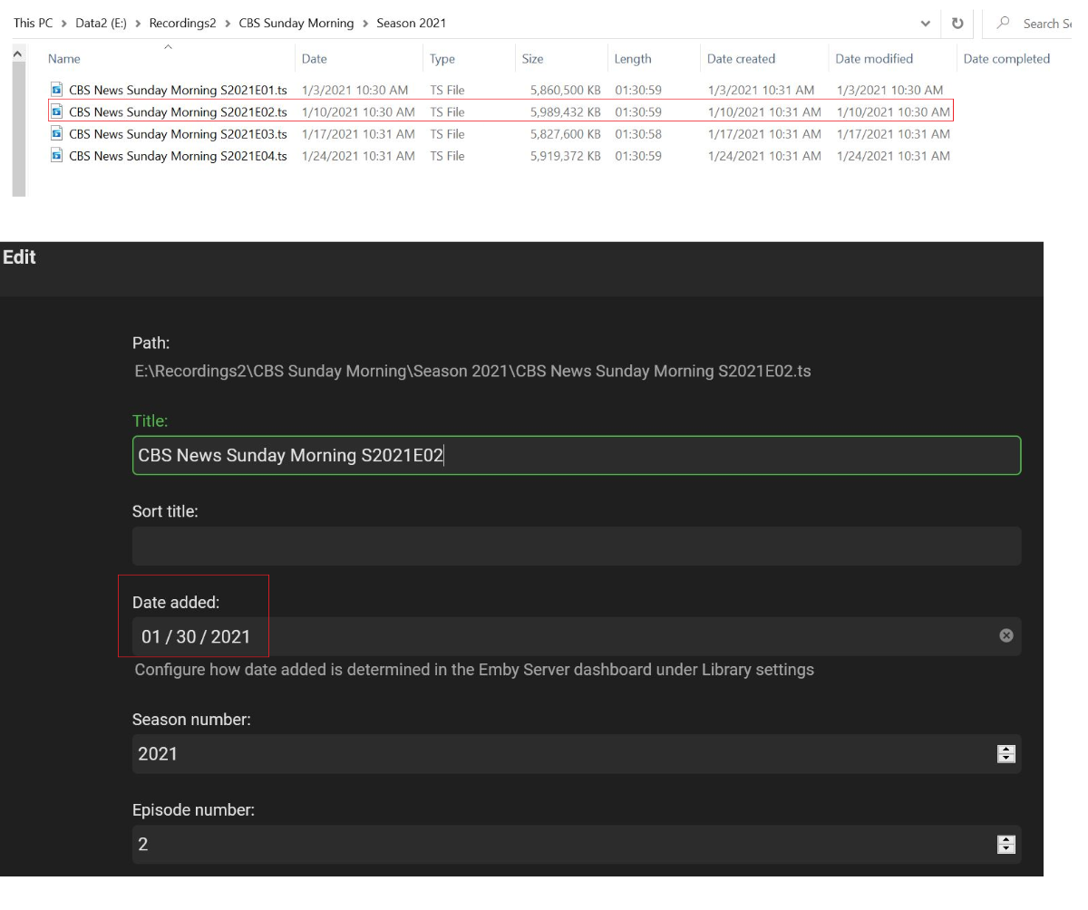 Dilbert 2 Posted February 1, 2021 Author Posted February 1, 2021 I checked the setting and it is already set to Use File Creation Date. I have Emby version 4.5.4.0 installed on Windows 10. In the screen shots you can see one example, where I tried using BulkFileChanger to ensure the dates were correct. For the Sunday Morning show episode 2 the Date, Date Created, and Date Modified are all set to January 10 in Windows, but the date added in Emby is January 30 because I moved the file from a different drive to drive E on that date. I also tried copying the file from R: to E: and then deleting the one on R: but the date changed to 1/30. I can manually edit the date added in Emby, but was hoping to find how to avoid having to do that when I move files. Thanks.
