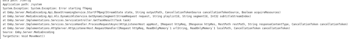 herki 3 Posted February 5, 2021 Posted February 5, 2021 (edited) Hi there - streams are starting to randomly crash and some will do it when i try to fast forward. When I check the logs this keeps coming up. Running Docker on top of Debian 9 *** Error Report *** Version: 4.5.4.0 Command line: /system/EmbyServer.dll -programdata /config -ffdetect /bin/ffdetect -ffmpeg /bin/ffmpeg -ffprobe /bin/ffprobe -restartexitcode 3 Operating system: Linux version 4.19-xxxx-std-ipv6-64 (gcc version 8.3.0 (Debian 8.3.0-6)) #1367069 SMP Fri Aug 7 08:31:57 UTC 2020 Framework: .NET Core 3.1.8 OS/Process: x64/x64 Runtime: system/System.Private.CoreLib.dll Processor count: 12 Data path: /config Application path: /system System.NullReferenceException: System.NullReferenceException: Object reference not set to an instance of an object. at Emby.Server.MediaEncoding.Api.BaseStreamingService.StartFfMpeg(StreamState state, String outputPath, CancellationTokenSource cancellationTokenSource, Boolean acquireResources) at Emby.Server.MediaEncoding.Api.Hls.DynamicHlsService.GetDynamicSegment(StreamRequest request, String playlistId, String segmentId, Int32 subtitleStreamIndex) at Emby.Server.Implementations.Services.ServiceController.GetTaskResult(Task task) at Emby.Server.Implementations.Services.ServiceHandler.ProcessRequestAsync(HttpListenerHost appHost, IRequest httpReq, IResponse httpRes, RestPath restPath, String responseContentType, CancellationToken cancellationToken) at Emby.Server.Implementations.HttpServer.HttpListenerHost.RequestHandler(IRequest httpReq, ReadOnlyMemory`1 urlString, ReadOnlyMemory`1 localPath, CancellationToken cancellationToken) Source: Emby.Server.MediaEncoding TargetSite: Void MoveNext() Edited February 5, 2021 by herki