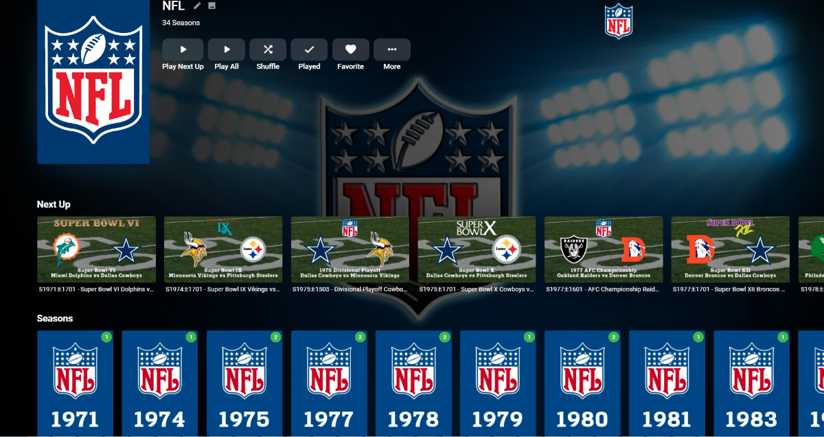 Carlo 4560 Posted February 12, 2021 Posted February 12, 2021 (edited) 5 hours ago, naeyaert said: So are you saying there is no way to structure my Sports folder now to get the correct metadata on each of my superbowl games? I've got Boxing, EPL, LALIGA, MLB, NCAAF, NFL, NHL, SERIEA, UEFA, UFC, WWF & Racing sports libraries. The easy method is to setup a sports library on disc with sub folders for each sport. Then setup your library like this: Then you can use a folder view as your default and get this: Then if you click on NFL football you would get all the years. Clicking on 2012 would give: Clicking on week 1 would give: I intentionally don't allow emby to generate images because sometimes it would grab a pic with scores showing. So anyway, with clear naming of your files you don't need meta-data. I'm probably going to reorganize a bit. For example multiple football (soccer) leagues are shown but I'll be moving that to one master then the individual leagues under it like I've done with Racing. UFC, Boxing & WWE are similar like this Soccer, Baseball, Football are all year/week/team vs team Edited February 12, 2021 by cayars
