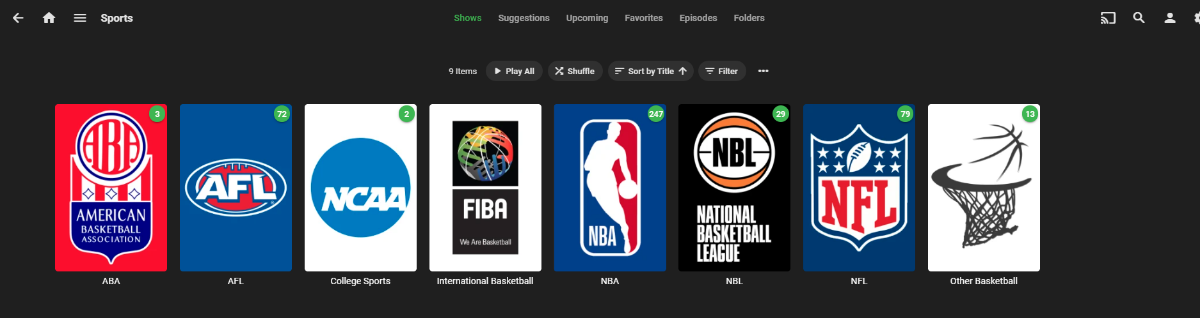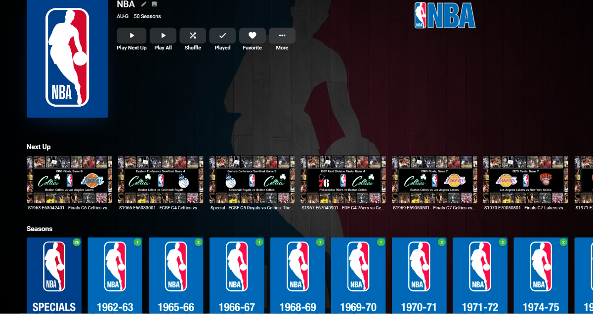 crusher11 1101 Posted February 13, 2021 Posted February 13, 2021 I use a TV Show library. Each sport is a show, each season is a season, each game is an episode. Specials holds pre-season games, all-star games, etc. For the NFL, I use a WWGG format - for example, the sixth game played in week four has episode number 0406. For the NBA, I use a YYMMDDGG format. So the fourth game on January 22, 2019 is episode number 19012204. This means that no matter which games I have, or when I add them, it all works fine. Just today I'm adding two games from the 2007 Finals. I already had games one and three, I'm adding games two and four. But with my episode format, they'll slot in exactly where I want them to. I then create custom thumbnails for each episode, and add them as backdrops as well so that image displays in Continue Watching.