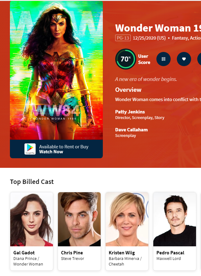 chuckr1958 2 Posted February 14, 2021 Posted February 14, 2021 Recently started to notice that after a movie is imported and the metadata is updated, the names of the characters played by an actor shows up as "Person". A recent addition was "Wonder Woman 1984" and each metadata on the actor is correct except for the name of the character. I checked both IMDB and the TheMovieDB and the names of the characters are attached to each actor. I've attempted to refresh the metadata and nothing changes. I've attached a screenshot from each.