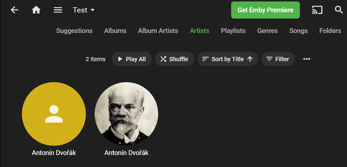Coert000 0 Posted February 28, 2021 Posted February 28, 2021 My libraries show the same artist name showing up many times in "Artist" view. I noticed other people running into the same issue over the years, but have not found a solution. To help isolate this, I made a library with a single track. This .mp3 track is tagged as: ffprobe.txt The Emby library shows the artist twice Examining the metadata in Emby, I find The first artist icon has MusicBrainzId bb97bf2b-c325-4d00-982b-f2423f7d8c4a. The artist page on MusicBrainz show that this is Stephen Gunzenhauser (conductor) The second artist icon has MusicBrainzId 819eaeb2-8dd8-48a5-ad07-0bcd137985ef. The artist page on MusicBrainz show that this is indeed for Antonín Dvořák (composer) I get the impression that Emby gets confused about the multiple entries in the ID3 artist tag. This is where I run into a wall. Does Emby use this tag? If so why does it show up as Antonín Dvořák. Or why is there none for Slovenská filharmónia. Quote artist : Antonín Dvořák;Stephen Gunzenhauser (conductor);Slovenská filharmónia The server log shows: embyserver.txt test.txt