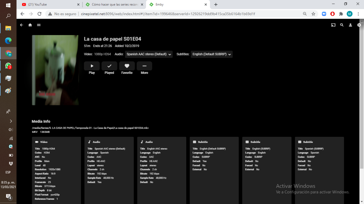 lauraareedondo 0 Posted March 15, 2021 Author Posted March 15, 2021 23 hours ago, Happy2Play said: Creo que hay un problema con Mostrar el nombre de la carpeta, ya que no se identificará correctamente, no creo que las carpetas de la temporada se reconozcan correctamente (pero es posible que lo hagan), y Emby no podrá analizar los nombres de los episodios correctamente (adivinar episodios de versión con ese nombre). Nombre de Emby TV: Emby Tampoco desea poner Programas / Series como tipo de contenido de película, ya que no se pueden identificar, ya que cada tipo consultará al proveedor de manera diferente. buenas estimado seguí su guía, pero nada .si bien emby reconoce cada episodio de serie y crea metadata , lo que busco es un visualización mas ordenada. y que no se este mostrando todo el contenido como si fuera películas independientes, también lo que quiero es que la series al reproducir el video permite poder pasar al siguiente video y anterior desde el mismo video lo cual no se puede , porque emby reconoce a cada episodio como si fuera una película independiente