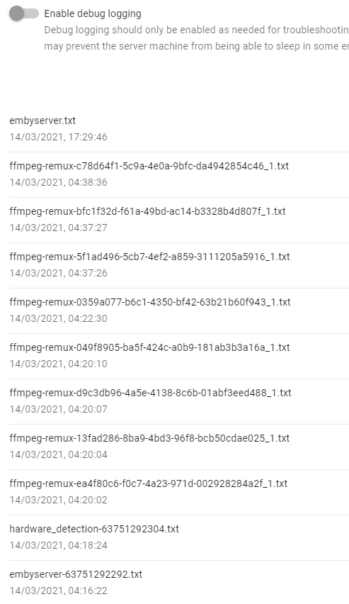Nem 2 Posted March 15, 2021 Posted March 15, 2021 Server: Unraid 6.8.3, Emby docker 4.5.4.0 Client: Windows 10, Chrome player Whenever I watch a movie on my laptop, after about 1 hour the player freezes and nothing in Emby works. I check my server and it is sitting at 100% CPU usage on all cores. Ultimately I have to hard restart my server because everything inside unraid is unresponsive. After the restart, I play the movie and the same things happens again after an hour. Nothing else on my unraid server causes this behaviour, so likely specific to Emby I remember something similar has happened in the past when using my desktop, and when trying to play videos on my raspberry pi via Kodi as well What can I do to diagnose this problem? Any likely culprits I can turn on/off for testing? I realize that posting logs here might help (should I turn on debug logging for this?), but I have so many of them from around the same time period that I'm not sure which ones would be useful: