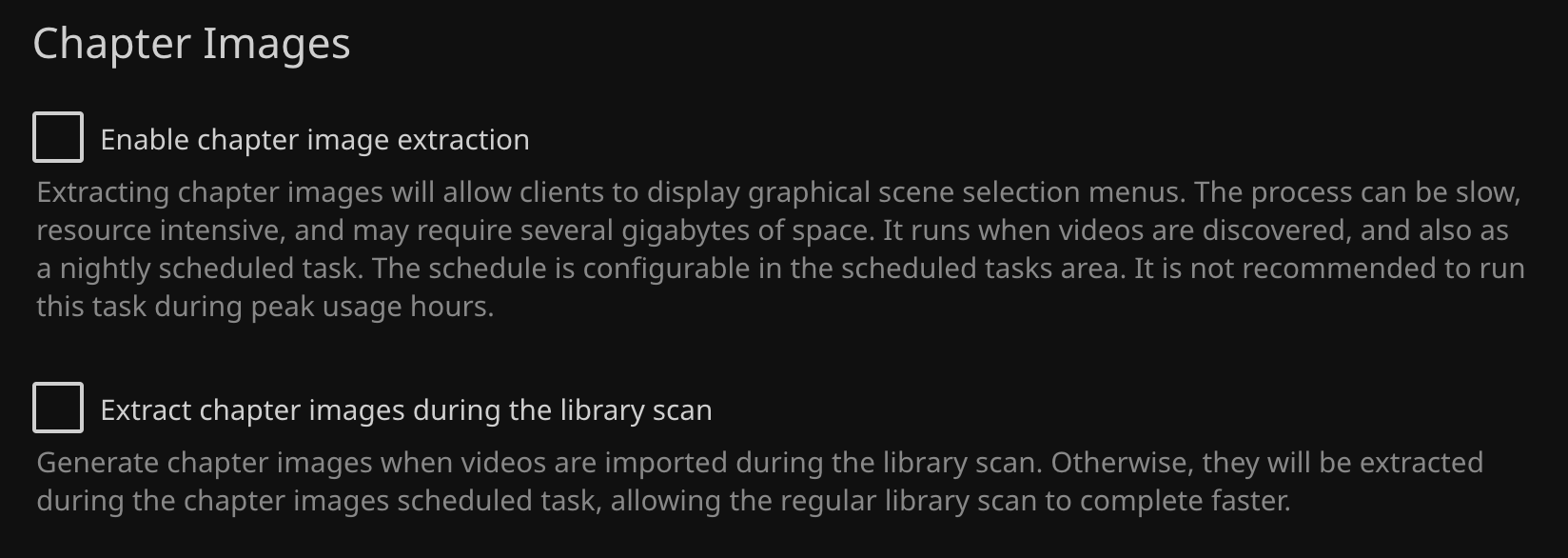 luser 37 Posted November 29, 2024 Posted November 29, 2024 +1 Allow chapter image extraction to be disabled. Please don't force chapter image extraction if "Video Preview Thumbnails" is enabled. These should be two separate options; like they are in Jellyfin. Screenshot from Jellyfin: https://i.ibb.co/q7qPsT9/jellyfin-disable-chapters.png