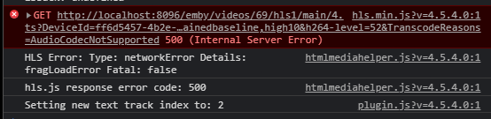 DanielFrank 11 Posted March 20, 2021 Posted March 20, 2021 (edited) Hello! I've been enjoying Emby for quite a while now - maybe a few years. I switched from Plex due to it's lowsy transcoding, and I've never experienced any major issues with Emby so far. But today, after a break from Emby and home streaming, I fired up Emby Server yet again, updated to the latest version (portable, I should mention), and I encountered a very weired problem. After starting a movie, it pauses after a few seconds. This seems to be happening only in the browser, not in Emby Theater. The console log says the following when the problem occurs: Quote hls.min.js?v=4.5.4.0:1 GET http://localhost:8096/emby/videos/69/hls1/main/4.ts?HIDDENFORSECURITYREASONS&VideoCodec=h264&AudioCodec=mp3,aac&VideoBitrate=139616000&AudioBitrate=384000&AudioStreamIndex=1&SubtitleStreamIndex=2&SubtitleMethod=Hls&TranscodingMaxAudioChannels=2&SegmentContainer=ts&MinSegments=1&BreakOnNonKeyFrames=True&ManifestSubtitles=vtt&h264-profile=high,main,baseline,constrainedbaseline,high10&h264-level=52&TranscodeReasons=AudioCodecNotSupported 500 (Internal Server Error) Can anyone help me figuring out a solution? embyserver.txt Edited March 20, 2021 by DanielFrank
