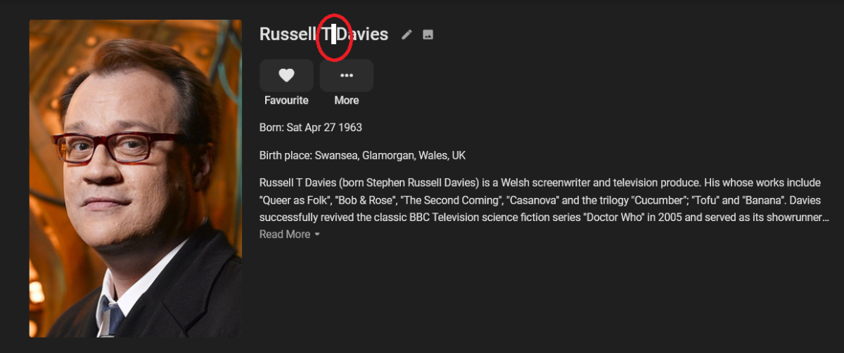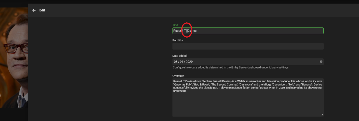 access 11 Posted March 27, 2021 Author Posted March 27, 2021 Actually integrating the data further, I can see that sometimes names are migrated into the Database like this automatically. I've noticed as well that there can be multiple spaces between names; Russell T Davies appears with one space when searching and viewing. I want to emphasize, that I didn't create this Person in Emby. But the Metadata actually has two spaces; So when I try to add "Russell T Davies" to shows/tv it never matches, despite being able to search for them to be same. So the defect is leading, trailing and in between words should only ever be 1 when added into the Database. Cheers