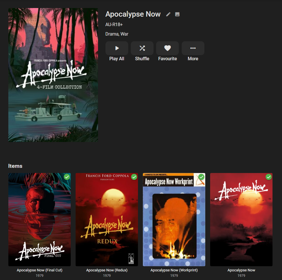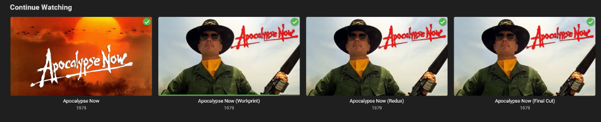 Happy2Play 9780 Posted March 30, 2021 Posted March 30, 2021 There is no way for Emby to distinguish this information as all items have the exact same providerids (IMDB, TMDB, TVDB) and that is how userdata is tracked. So there is no such thing as different versions it is one item. Multi-versioning is built around quality/resolution not different cut as discussed in numerous topic. So 4 cut of Apocalypse Now will always be one item as they are the same movies.