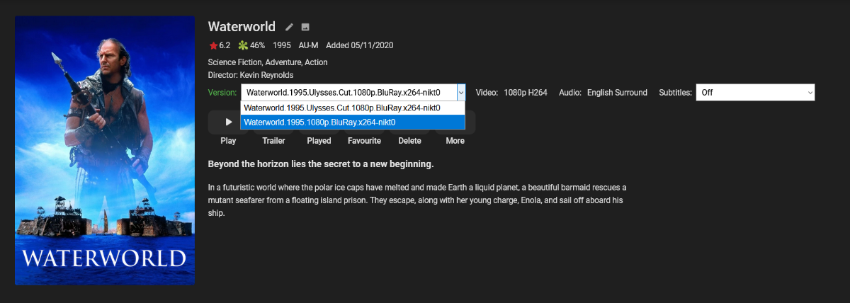 access 11 Posted March 30, 2021 Posted March 30, 2021 Hello! So I am not sure if there is a way to have multiple versions of the same movie with different meta data. If I include two versions of the film; \movies\Waterworld (1995)\ -- Waterworld.1995.Ulysses.Cut.1080p -- Waterworld.1995.1080p I see two versions of the film, however unless I'm mistaken it removed information such as Runtime as they are both different. Typically though as you choose each film, the Cover Art should change, the Credits could change the Description could change so it should be able to contain multiple sets of information for each version. My work around is just to use Collections such as the infamous four versions of Apocalypse Now I have just grouped as a Collection and added my own Meta data for each film. This does become messy with the Collections Plugin, take say Star Wars, Empire Strikes Back and Return of the Jedi. These three films now have five major versions released each and as they are added as separate films in Emby Collections plugin now has 15 films in it. The ideal solution would be to have them as 1 single Film but with different meta data, not sure if there is a feature I'm not utilizing to achieve this? Thanks! 1