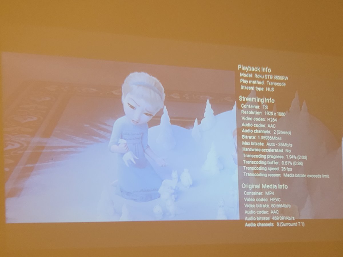tmmedic20 1 Posted April 17, 2021 Author Posted April 17, 2021 Just now, cayars said: @tmmedic20 Can you check "Allow subtitle extraction on the fly" from transcoding menu and turn this off if enabled and test again? At work for the next 48 hours but will do soon as I get home. As well as reuploadong the full size stats. Here is a picture of the stats that I grabbed using a roku stick (sorry don't remeber the model number) on a projector which also played fine.