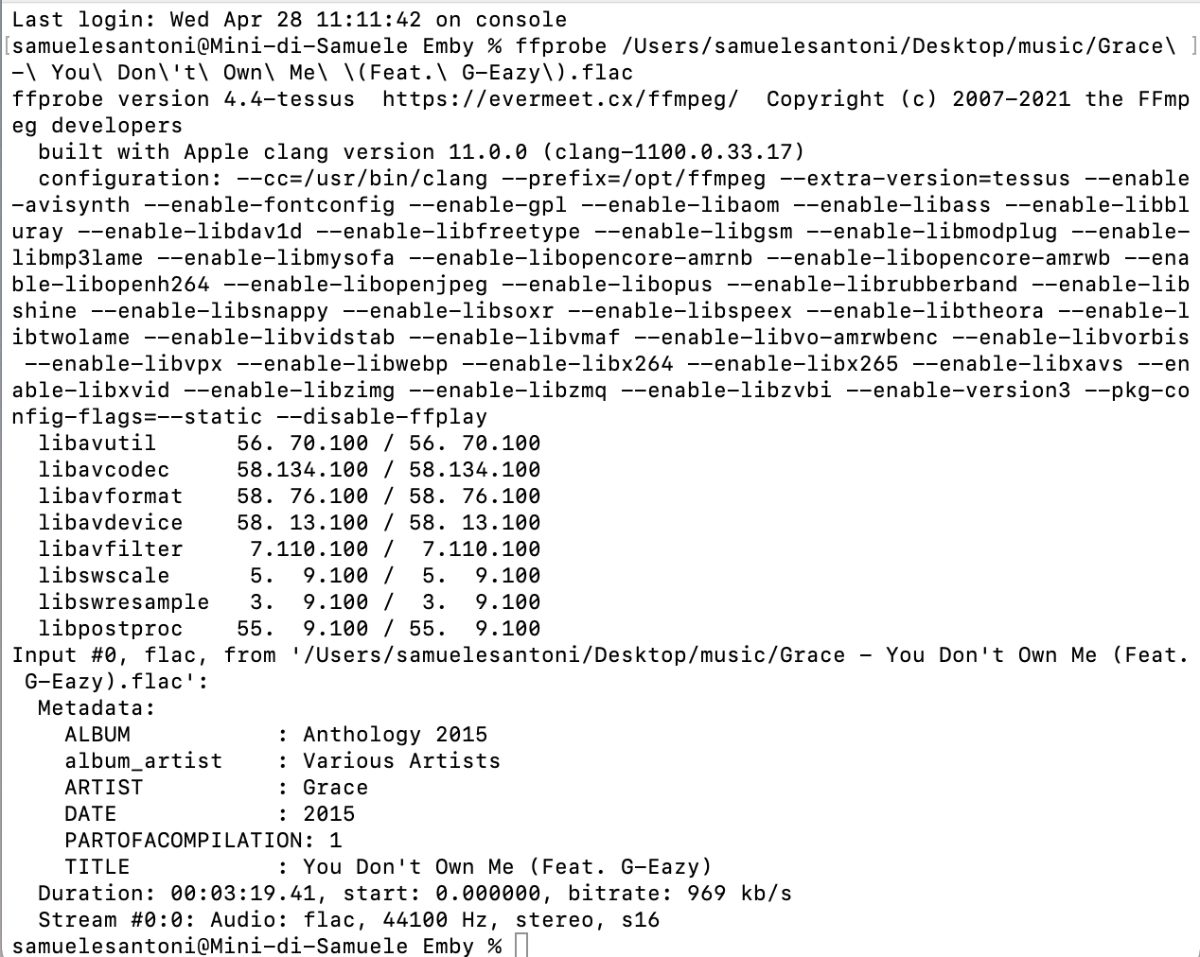 Eleumas31 18 Posted April 28, 2021 Author Posted April 28, 2021 (edited) How suggested by @Hxemby001 i downloaded Emby folder from NAS on my Mac. After i run the terminal from folder i have "tested" the song. This is the result: Edited April 28, 2021 by Eleumas31