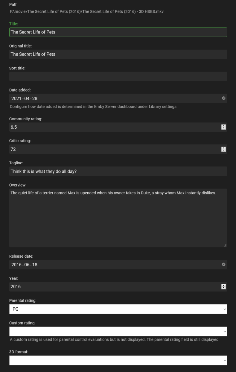 Happy2Play 9780 Posted April 28, 2021 Posted April 28, 2021 Just now, nodiaque said: Oh, I though it was from the file naming convention. No you can have almost anything, so "Movie - anything" is just a label. But filtering goes off of physical media info. 2 minutes ago, nodiaque said: For information, 3D detected on my latest with this form: The Secret Life of Pets (2016) - 3D-HSBS There is space between between the first -. Using a space between 3D and HSBS didn't work. Tried in a multi-version folder, didn't work For 3D identification to work you can't have spaces have spaces around the hyphen as that is mulit-versioning " - ". The Secret Life of Pets (2016)-3D-HSBS The Secret Life of Pets (2016).3D-HSBS