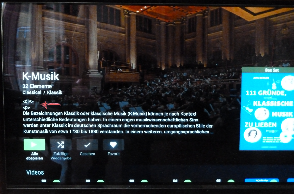 fxwegr 6 Posted May 5, 2021 Posted May 5, 2021 First a thanks for the new release of Androed TV. A great progress. However, there is still a big wish open: Like the WEB interface, Android TV should also be able to process HTML tags. Unfortunately it does not recognize the tags as such, but treats them like normal text. For clarification I have attached two screenshots. It would be nice if the problem could be solved with the next release. Regards Reinhard