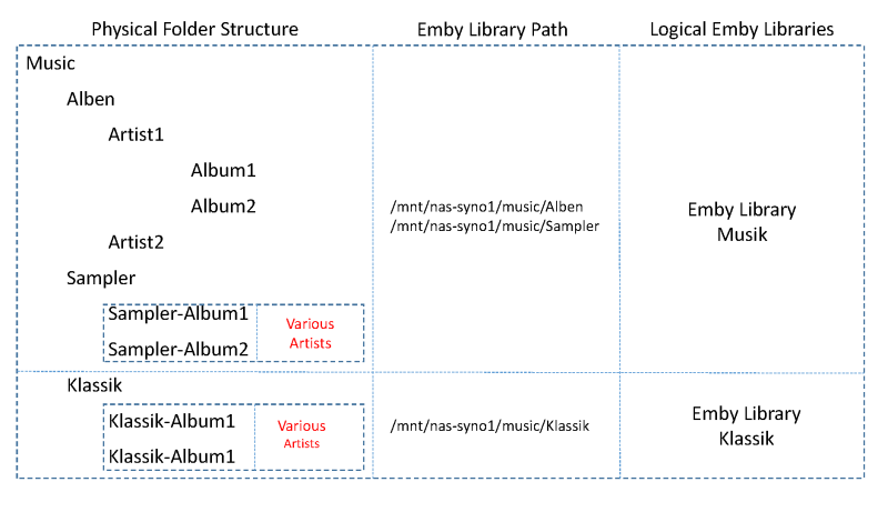 fxwegr 6 Posted May 12, 2021 Posted May 12, 2021 I have the following problem with the Emby server, which is incomprehensible to me: In the Emby display "Artists" or "Album Artists" I find, inexplicably for me, the artist "Verschiedene Interpreten" as well as the artist "Various Artists". However, all the albums/titles in question are correctly and uniformly tagged with "Various Artists" (MP3 tags). The problem does not occur with all other artists. How does this happen? How can I merge the titles that are tagged with "Various Artists" under one artist? Attached the library structure I used.