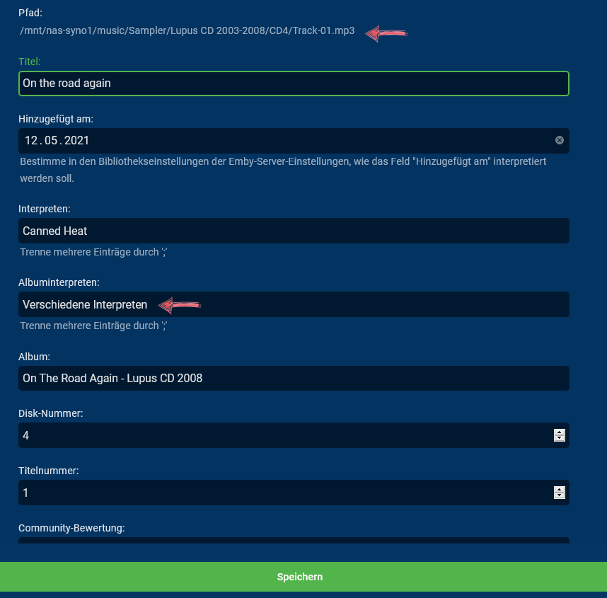 fxwegr 6 Posted May 14, 2021 Author Posted May 14, 2021 I have carried out the suggested tests - without success. I could not find the cause of the problem, but I was able to find a workaround. Again the description of the situation: Emby recognises a total of 57 sampler albums. For all sampler albums the albumartist ID3-tag is set to "Various Artists". From this inventory Emby generates two different Albumartists namely: Various Artists and Verschiedene Interpreten 3 albums are assigned to the albumartist "Various Artist". The album artist "Verschiedene Interpreten" is assigned 54 albums. In the case of various albums, I could see that individual traks of this album were assigned to the albumartist "Verschiedene Interpreten", but others were assigned to the albumartist "Various Artists". So the album was split between two different albumartists. The workaround: I changed the ID-3 tag "Album Artist" of the 3 albums that were assigned to the albumartist "Various Artists" from "Various Artists" to "Verschiedene Interpreten" and rescanned the library. After that, all sampler albums were under the album artist "Verschiedene Interpreten". The album artist "Various Artists" had disappeared. The whole thing looks very strange. I have the strong impression that the Emby logic is not quite clean at this point. Thanks you for all your help.