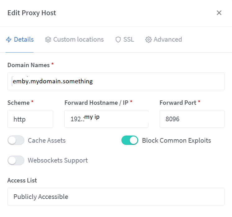 Solution pir8radio 1312 Posted May 13, 2021 Solution Posted May 13, 2021 36 minutes ago, DESTINYLORD said: This is how my nginx proxy manager looks like (also a let's encrypt ssl). Basically it is not even a huge issue rather weird, as I am on the same network on all devices. My connection to the web doh is big time poop. At the moment it is 30mbps download and about 5-6mbps upload. The issue will be in your nginx config, you are using this GUI to build your config, 90% of the time this is fine for most applications, but emby requires some specific headers to be passed/included. You will need to edit the text config. If you click my avatar, then the "About Me" tab on my profile, there is an example config if it helps.