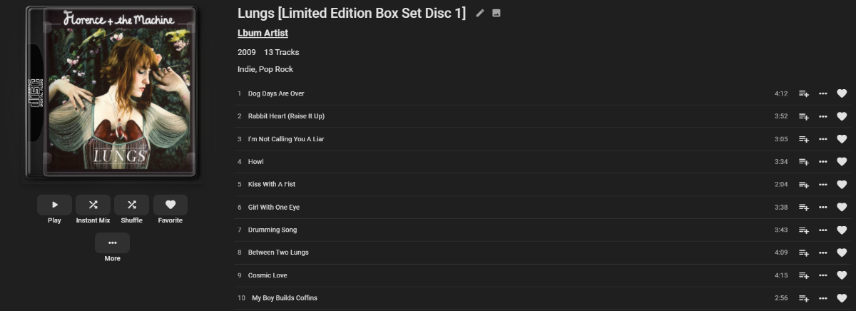 BillybobBilly 18 Posted May 18, 2021 Author Posted May 18, 2021 (edited) 11 minutes ago, Luke said: Hi, that value is probably tagged in the audio files somewhere. If you install Picard you might be able to see it. I run all of my files through Mp3tag and I'm running a macro that automatically deletes all tag information that doesn't fit the criteria I've listed above. Does Picard modify tag information that MP3tag is unable to interact with? I was under the impression that MP3tag is the most comprehensive source for fixing/editing this information. Picard, in my experience, is completely unreliable and majorly messed up my collection about 6 months ago resulting in around 3-400 hours of manually fixing stuff... This was user error but I've been soured ever since. Additionally, I pulled up a different album that has this issue and I inspected the metadata for that album in Emby. It lists the following: I'm not really sure what is going on with this information.. It is just dropping off the first letter of the category. This looks like an Emby issue moreso than an issue with the file or tags I've set up. Especially since, like I said before, I've cleared all the tag information. The file structure for this album is as follows, so maybe it has something to do with the issue? Music\!K\King Weed\The Seven Sins in Doomsday [2020] I've got quite a few other albums all configured the same way without issue. I'm only seeing this problem with the florence listed above (actually all 4 albums from that box set), this King Weed album and an album by The Brian Jonestown Massacre (though this album I believe has issues with its tag information because it shows up as non-album tracks... I'm investigating this issue separately)) Edited May 18, 2021 by BillybobBilly