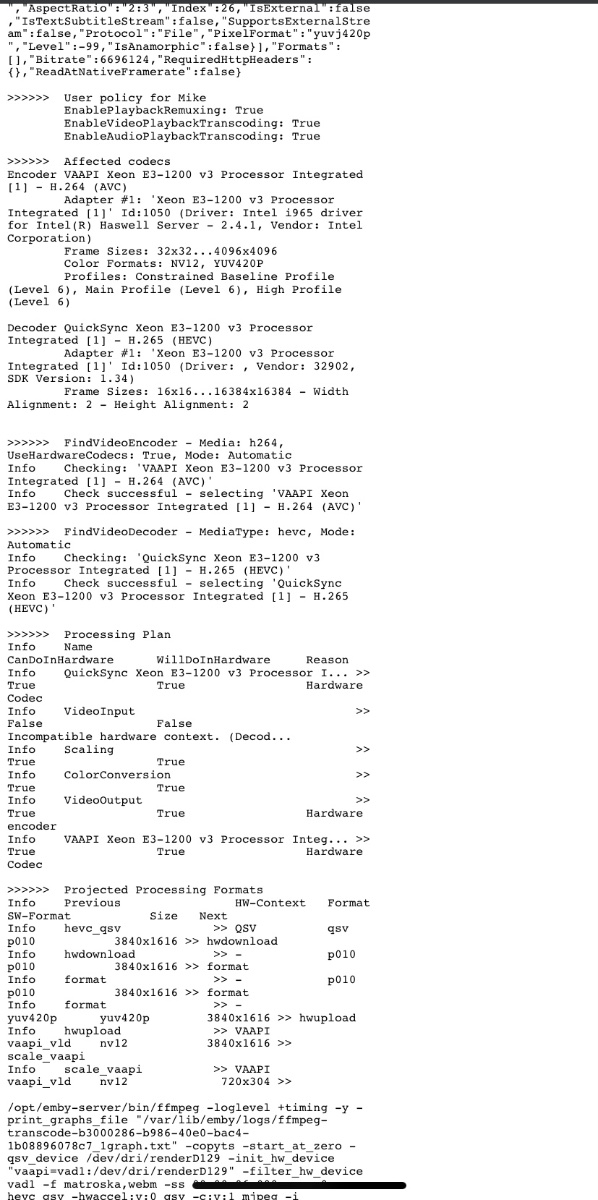 Q-Droid 989 Posted May 19, 2021 Posted May 19, 2021 Well, you know VAAPI works for HW so until you get a definitive answer from the devs you can set that as the priority AND disable all h.265 (HEVC) decoders/encoders. This should stop delays in streaming and errors in the logs. Both Quick Sync and VAAPI are using HW for encoding and decoding. I also noticed you're running a beta release of Emby which could explain some of the odd HW transcoding behavior.