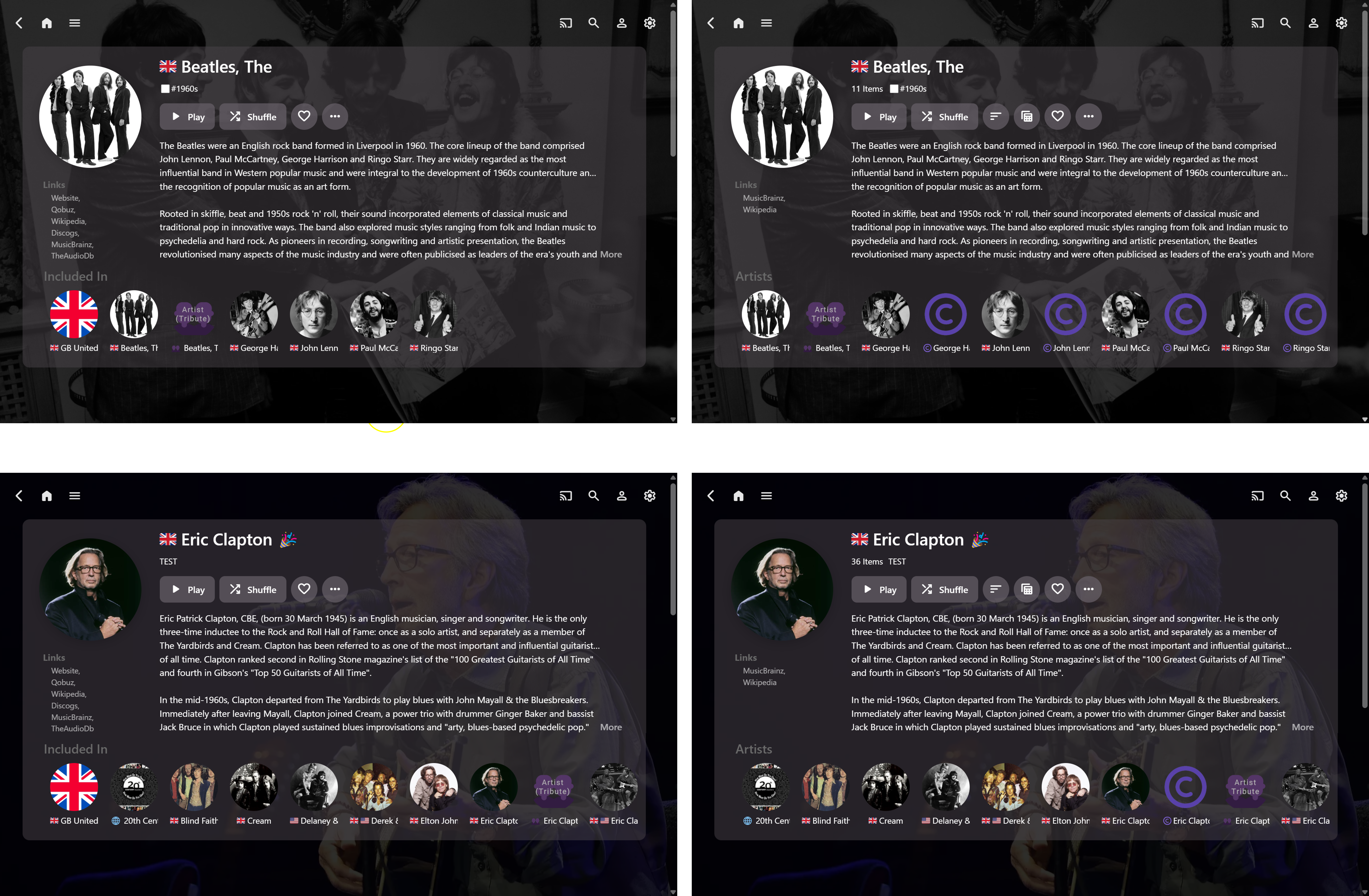 user24 313 Posted March 15, 2025 Posted March 15, 2025 For 2000+ Album Artists, I’ve now partially set up 600 “Related Artists” Collections to test out the idea on a larger scale. The (touchscreen) navigation is great and it’s very fast to ‘jump around’ all over my music library now, but the landscape page views still need refining further... Borrowing ideas from Qobuz and Apple Music, here’s some working full-screen updated examples: (The LHS images are Artist detail pages and the RHS images are corresponding Collection detail pages.) Filling the top-of-page landscape view with Artist-specific info only, allows for more Artist detail to be shown. It seems more focused to me, but also less cluttered and less distracting because the Albums/Songs/Other info is hidden below. The layout isn’t quite as good in portrait mode, nor on a small phone screen, but that’s not my goal. So far, so good… but still a lot more to do, especially with the Sections below, when scrolling down the pages… 1 1