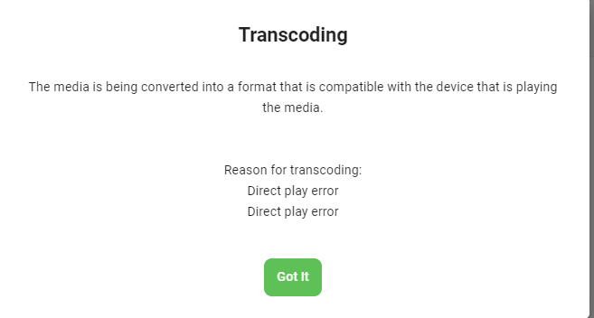 Luke 42078 Posted May 23, 2021 Posted May 23, 2021 Not necessarily. It means there's something about your file that the video player couldn't handle, and so it automatically switched to transcoding in order to allow it to play successfully. If you want to go over an example we might be able to provide more insight: Thanks.