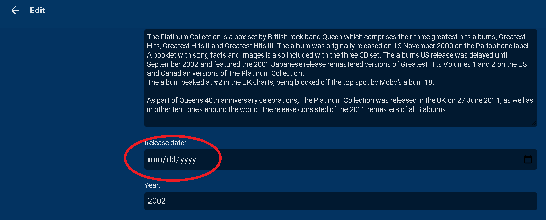 Carlo 4561 Posted May 25, 2021 Posted May 25, 2021 @Luke Everyone of my music albums is missing the release date but instead had this text inserted.