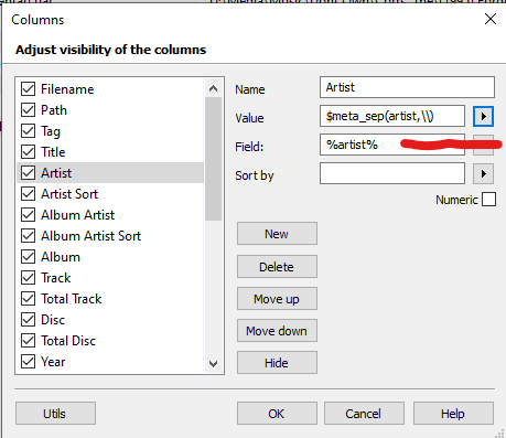 koopa8840 24 Posted June 4, 2021 Posted June 4, 2021 (edited) 1 hour ago, spon said: Picard has issues sometimes related to the Artists tag (not Artist). There are instances where Picard shows the Artists tag as containing multiple artists, while Emby and other apps (Tag Scanner) only show the first value. As far as I can tell this is a Picard issue, possibly related to mp4 files. I can't check the Artists tag in MP3Tag b/c it doesn't appear to support it. MP3Tag supports mp4 files. The problem you are having with MP3Tag not displaying ARTISTS is you have to set the column header to display for the ARTISTS field. What you are seeing is the ARTIST field. See the screenshot. Change the field from %artist% to whatever field lists the multiple artists. You can, also, right click on the file and select Extended Tags to see all the tags within the file. MP3Tag has Discogs script. What info does it not pull that you want? You can, also, setup an action to replace all // (or whatever symbols) to ; with the artist/artists fields. Edited June 4, 2021 by koopa8840 Added screenshot