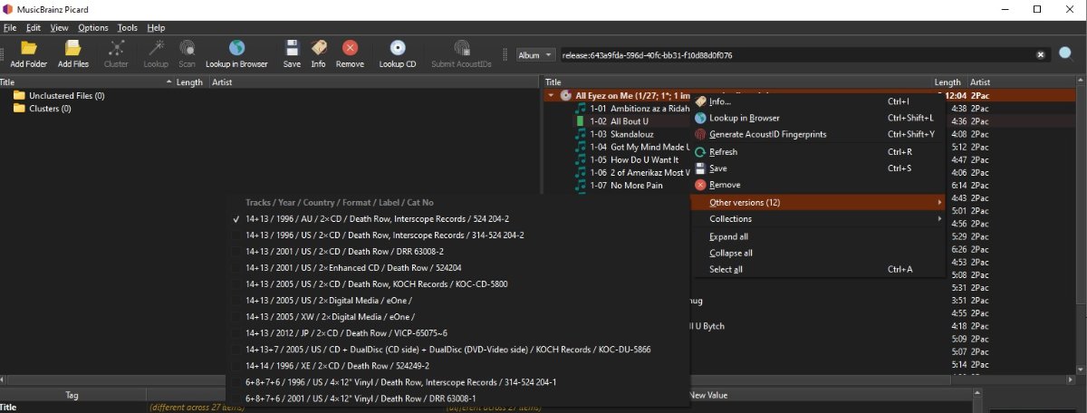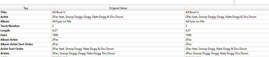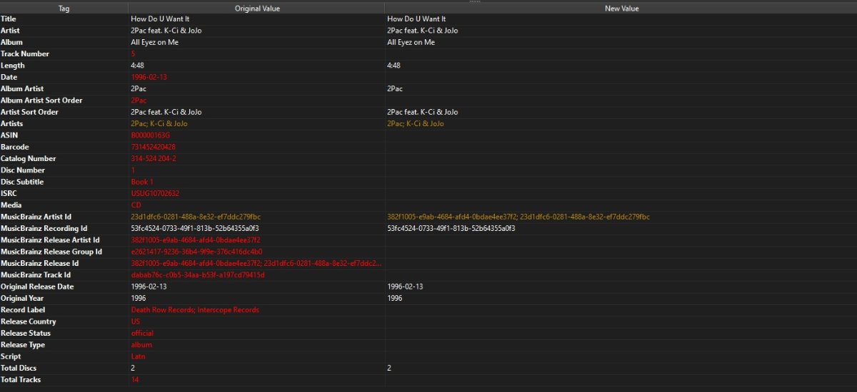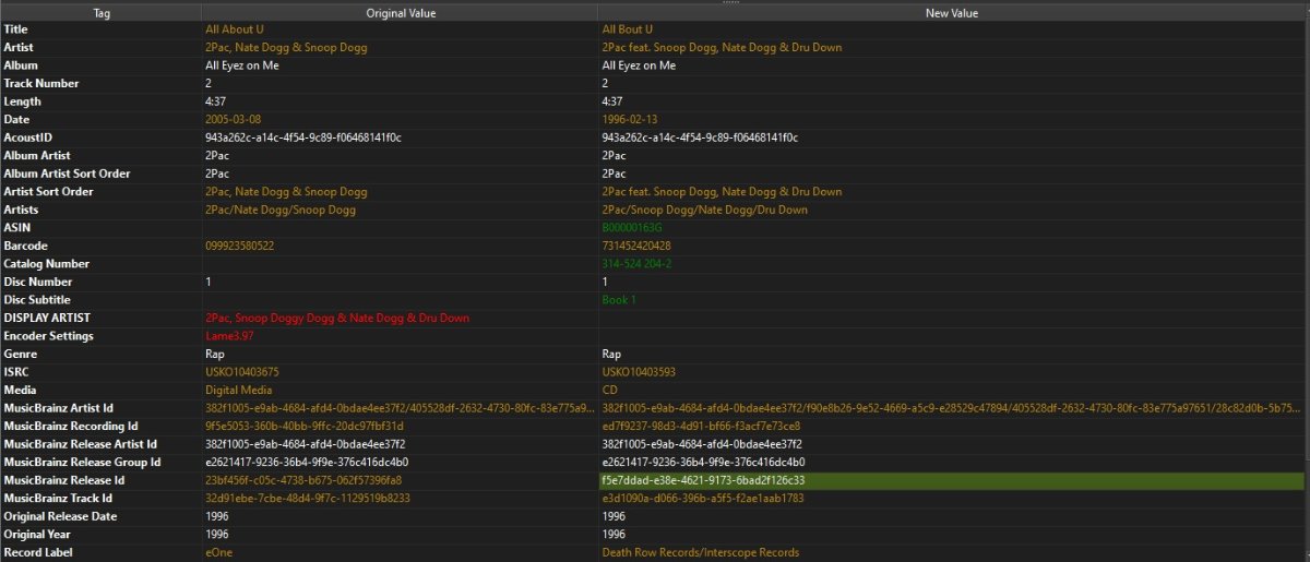 spon 26 Posted June 5, 2021 Author Posted June 5, 2021 36 minutes ago, Happy2Play said: Recording “All Bout U” by 2Pac feat. Snoop Doggy Dogg, Nate Dogg & Dru Down - MusicBrainz Do you mind posting or pm'ing that track to test with. Hmm the page did not update properly as I see this is the first option not the AU option. Sure, here you go. https://we.tl/t-uEaI0jDoDE for testing. Thanks! When I tagged it with MB, I did change the version to the US Disc version. I think the default is the digital version.